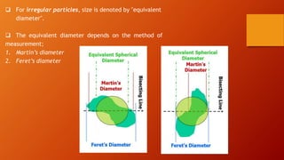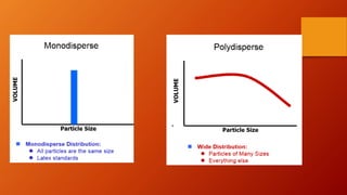 This document discusses particle size distribution (PSD), which is a list or function that defines the relative amounts of particles sorted by size. It explains that PSD is important for industries like pharmaceutical, chemical, ceramics, etc. It describes different size terminology used like micrometers and nanometers. It also discusses different ways to measure particle size based on volume, weight or area. Finally, it provides examples of analytical distribution functions used to model PSD like normal, log-normal and Weibull distributions.