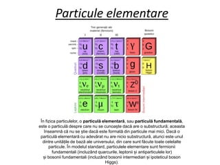 În fizica particulelor, particulele elementare sunt particule fundamentale fără substructură cunoscută, incluzând fermioni (quarci și leptoni) și bosoni. Fermionii constituie materia, iar quarcile interacționează prin forța nucleară puternică, în timp ce leptoni, precum electronul, participă la interacțiunile electromagnetice. Bosonii sunt responsabili pentru interacțiuni nucleare slabe și includ gluoni, bosoni W și Z și fotoni.