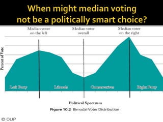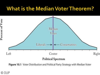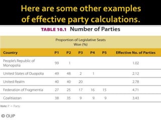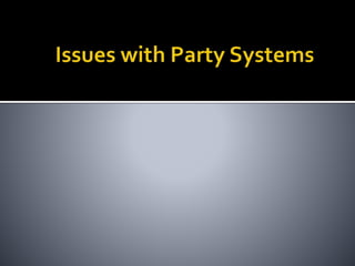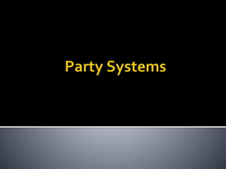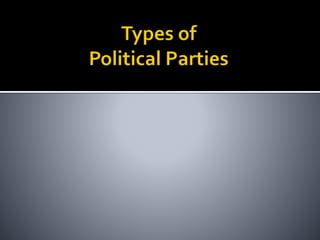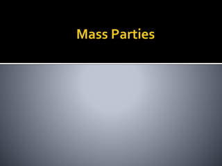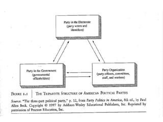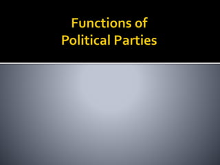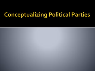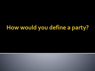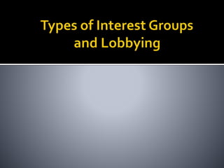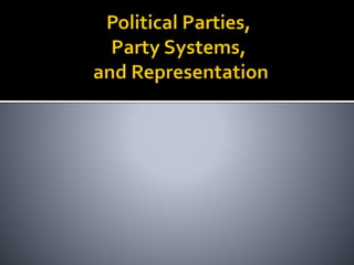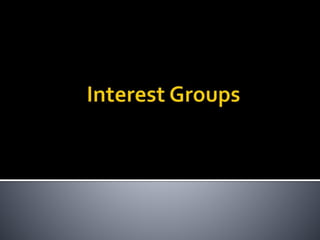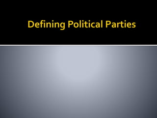 This document discusses political parties and interest groups. It begins by defining political parties as broad coalitions that recruit candidates, have identifiable labels, aim to control government, and promote particular policies. It then examines types of party systems, functions of parties, and components like party organizations. The document also defines interest groups as collections of citizens who share interests and try to influence policy, discussing their relationship with the state and strategies like lobbying and advocacy.
