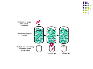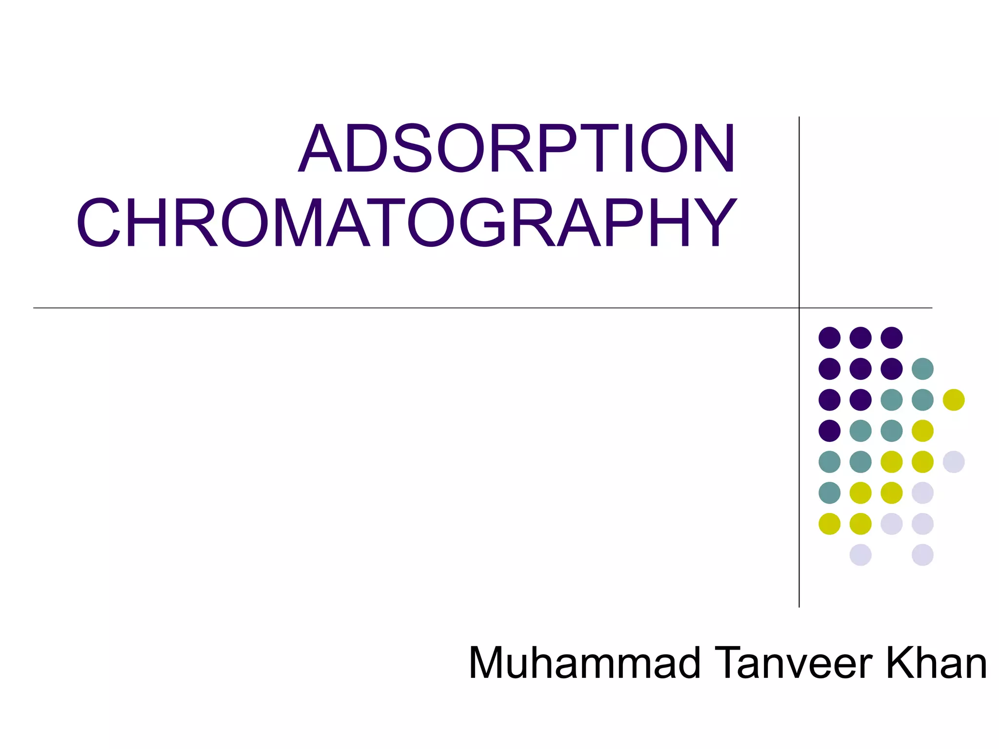 Adsorption chromatography is a type of chromatography where the mobile phase is adsorbed onto the surface of a stationary solid phase. Separation occurs due to differences in how strongly components compete for active sites on the adsorbent, based on electrostatic forces. Common adsorbents include silica gel and alumina. Thin layer chromatography is a technique where the mobile phase flows over a thin layer of adsorbent on a plate, separating components by differential migration.