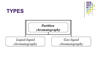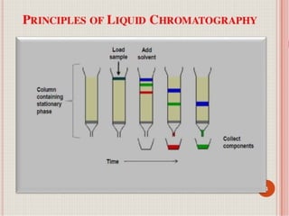 This form of chromatography is based on a thin film formed on the surface of a solid support by a liquid stationary phase. Solute equilibrates between the mobile phase and the stationary liquid. Components within a mixture are separated in a column based on each component's affinity for the mobile phase. If the components are of different polarities and a mobile phase of a distinct polarity is passed through the column, one component will migrate through the column faster than the other.