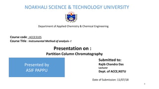 This presentation discusses partition column chromatography. It begins with an introduction and presenter information. It then defines partition chromatography as a method of separation where components in a mixture distribute between two liquid phases due to differences in partition coefficients. The presentation notes that partition chromatography is the most widely used type of HPLC, where the stationary phase is a second immiscible liquid bonded to the column. It discusses the principles of how separation occurs due to differences in how components partition between the two phases. Finally, it provides examples of applications such as separation of compounds in biological and environmental samples and determination of water quality.