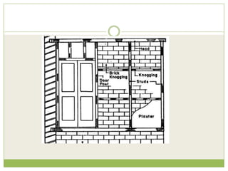 Partition walls are used to divide interior spaces. They can be load-bearing or non-load bearing. Common types include timber, brick, clay block, concrete, glass, and metal partitions. Timber partitions use a wooden framework, while brick partitions come in plain, reinforced, and nogging styles. Clay block and concrete partitions use hollow blocks or precast panels. Glass partitions employ sheets or hollow blocks for visibility and soundproofing. Metal partitions make use of metal lath and plaster or steel framing. Proper installation of the chosen partition wall type is important for strength and function.