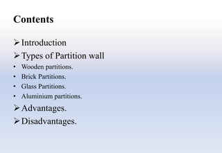 The document discusses different types of partition walls, including wooden, brick, glass, and aluminum partitions. Wooden partitions are light but not fireproof or suitable for damp areas. Brick partitions are fire resistant and soundproof but more durable. Glass partitions provide aesthetics and allow light while being damp, sound, and heat proof. Aluminum partitions are light, strong, and widely used in offices and industrial buildings. The document outlines advantages such as privacy and dividing space efficiently, and disadvantages such as using non-sustainable materials and potentially decreasing living space if placed incorrectly.