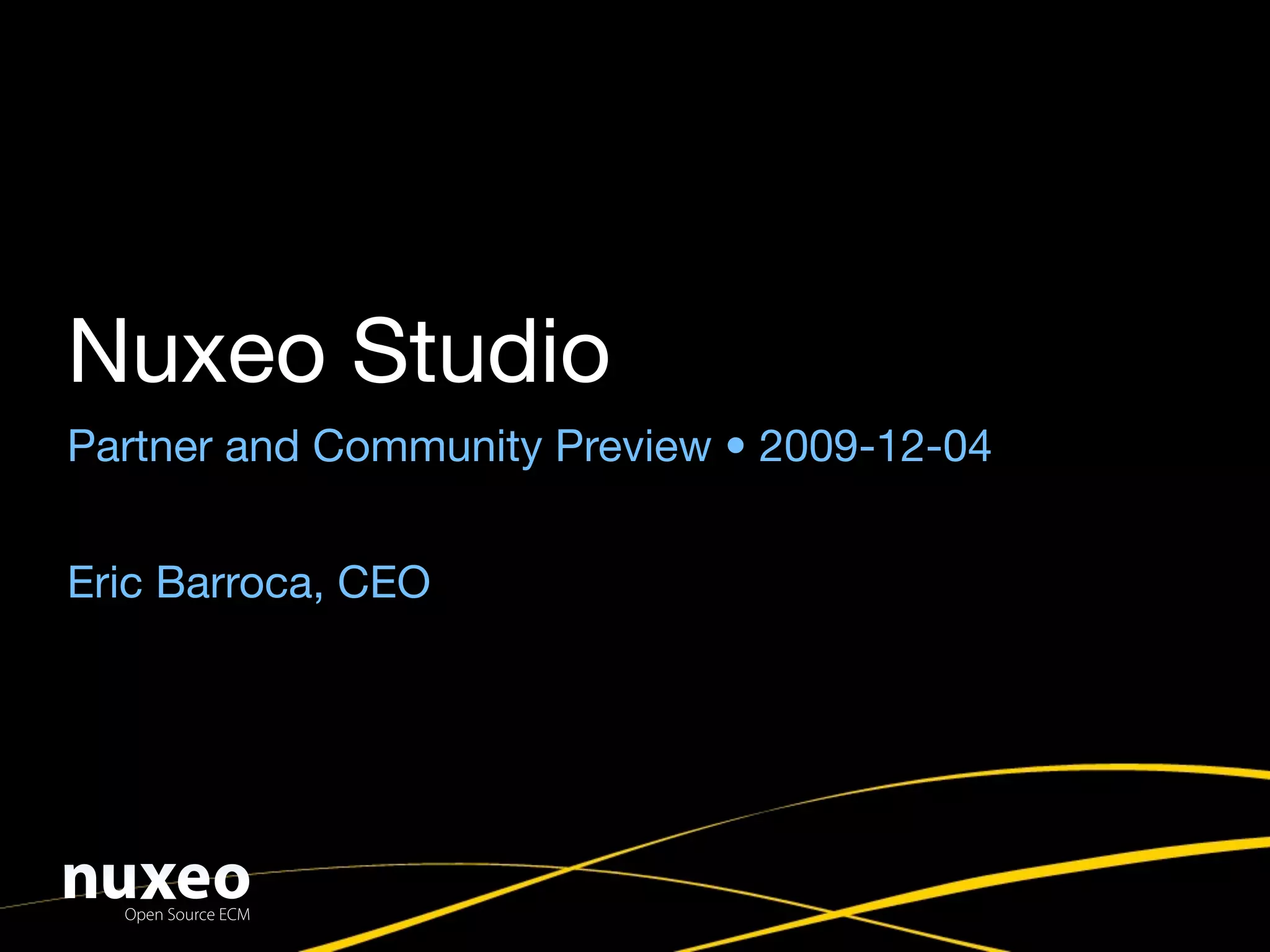 This document introduces Nuxeo Studio, a web-based tool for configuring and customizing the Nuxeo Enterprise Content Management platform. Nuxeo Studio allows functional administrators to graphically design content types, lifecycles, and metadata without coding. It is meant to dramatically shorten application development time and allow business users to easily prototype and modify content apps. The document outlines key features of Nuxeo Studio and provides a pricing overview.