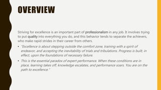 This document provides an agenda and materials for a two-day training on building a culture of excellence. Day one will cover topics like team dynamics, personality types, and overcoming team dysfunctions. Day two focuses on leadership principles, accountability, change management, diversity, communication and work-life balance. The training uses exercises and group discussions to teach concepts like trust, conflict, commitment and accountability. It aims to equip participants with leadership skills and techniques for stronger team performance.