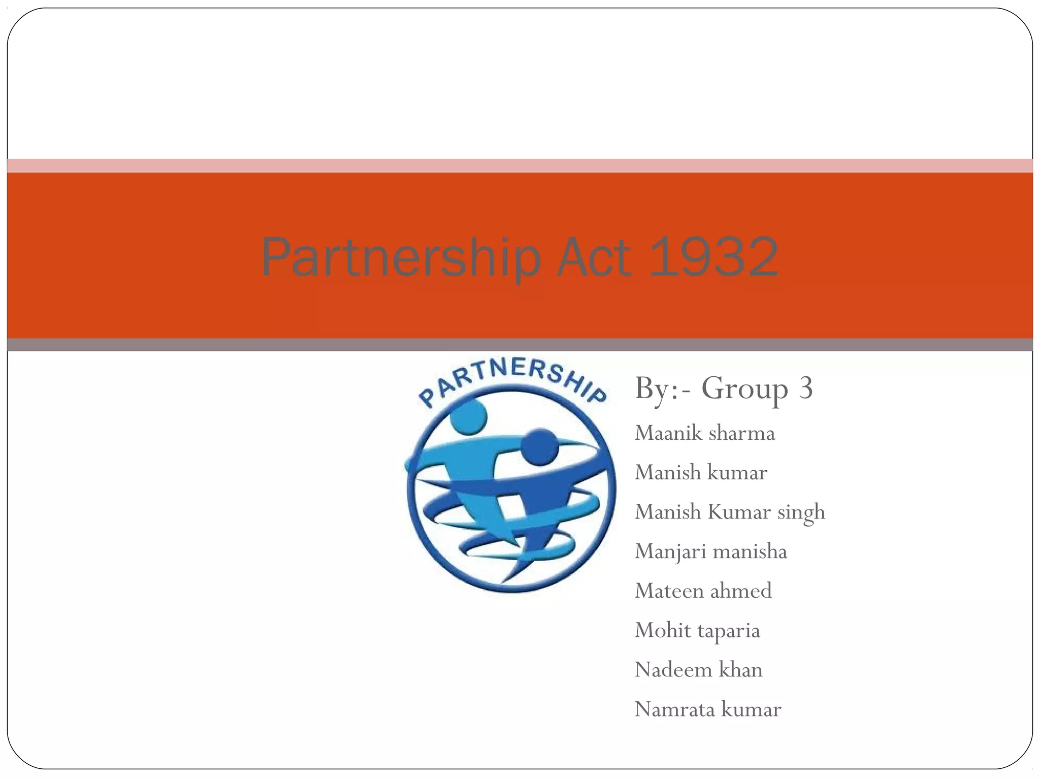 The document summarizes key aspects of partnership law under the Indian Partnership Act of 1932.