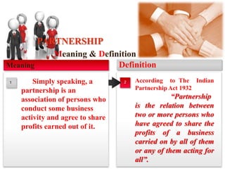 The document defines partnership under the Indian Partnership Act of 1932 as the relation between two or more persons who have agreed to share the profits of a business carried on by all or any of them acting for all. It outlines the key characteristics of a partnership like the agreement to share profits, unlimited liability, joint ownership of property.