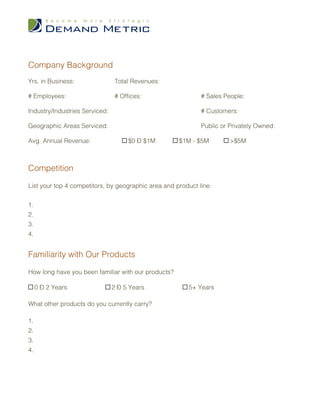 This partnership application form requests information from companies interested in becoming an authorized partner, including company contact details, background, competition, familiarity with products, marketing plans, and sales estimates. Applicants are asked to indicate how they want to partner as a distributor, manufacturer, or agent and provide details on their company, marketing strategies, and projected annual revenue from the partnership. By signing the form, applicants consent to verification of the information provided.