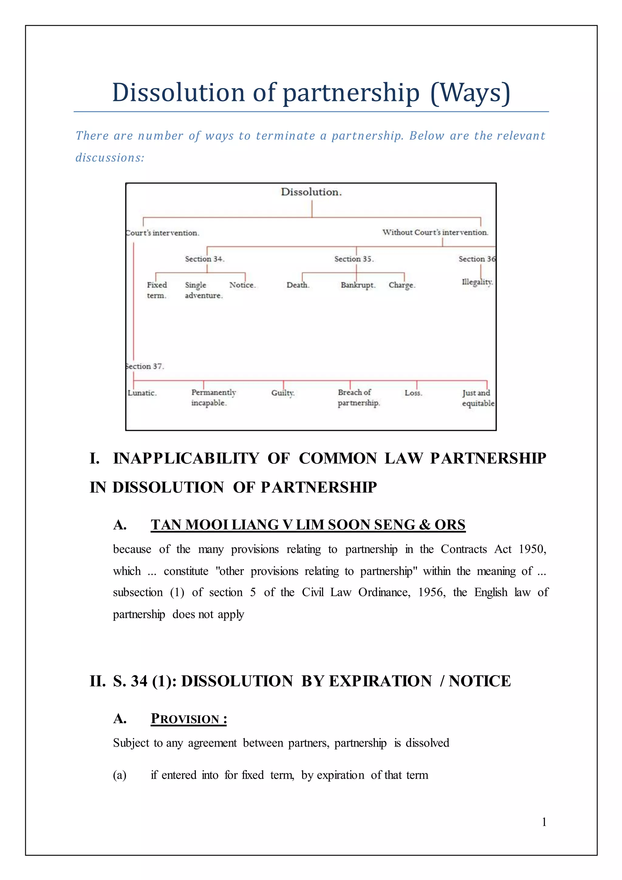 The document discusses the various ways to dissolve a partnership, including expiration, notice, death, bankruptcy, and illegality. It outlines relevant legal provisions and case law regarding the rights and obligations of partners during dissolution and the consequences that follow. Additionally, it addresses how partnerships can be dissolved through court intervention under specific circumstances.