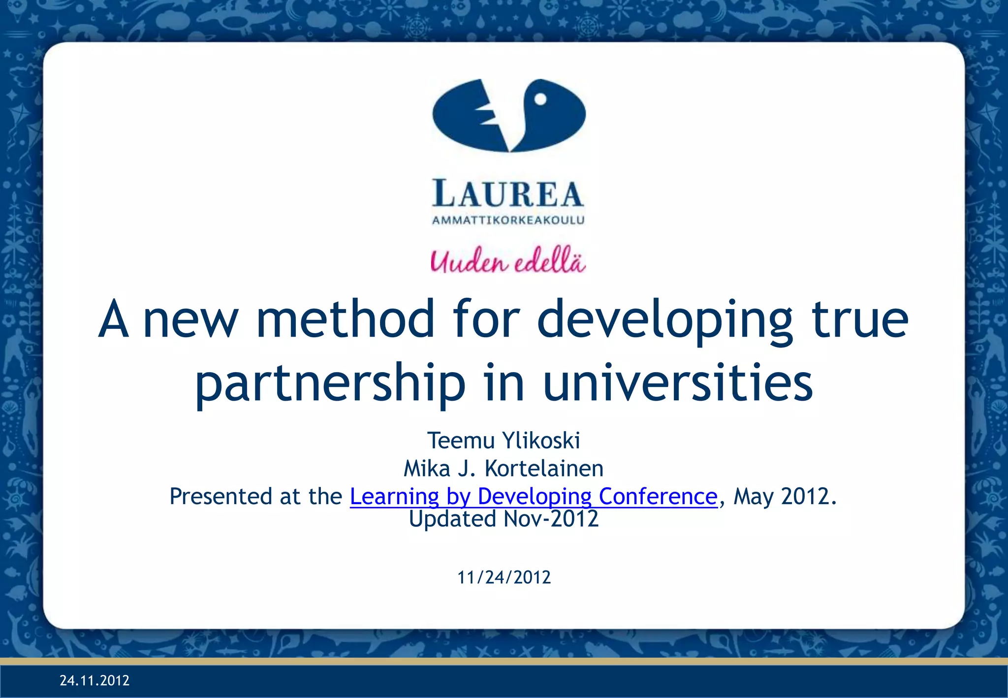 This document proposes a new method for developing true partnerships between universities and businesses. It describes a program run by students at the Lohja Business Lab where they are responsible for contacting local companies, promoting collaboration opportunities, and documenting the partnerships in a customer relationship management database. This systematic approach to managing partnerships provides benefits like improved experiential learning for students, deeper long-term relationships with companies, and accumulated knowledge that can be used to inform future projects.