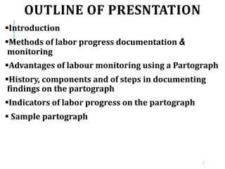 The document discusses labor monitoring using a partograph. It outlines the components and steps for documenting findings on the partograph, including monitoring cervical dilation, descent of the fetal head, uterine contractions, fetal heart rate, and maternal vital signs. Abnormal labor patterns that cross the alert or action lines on the partograph indicate slow progress and need for further evaluation or referral. The partograph is an important tool for early detection of abnormalities to prevent prolonged labor and improve maternal and neonatal outcomes.
