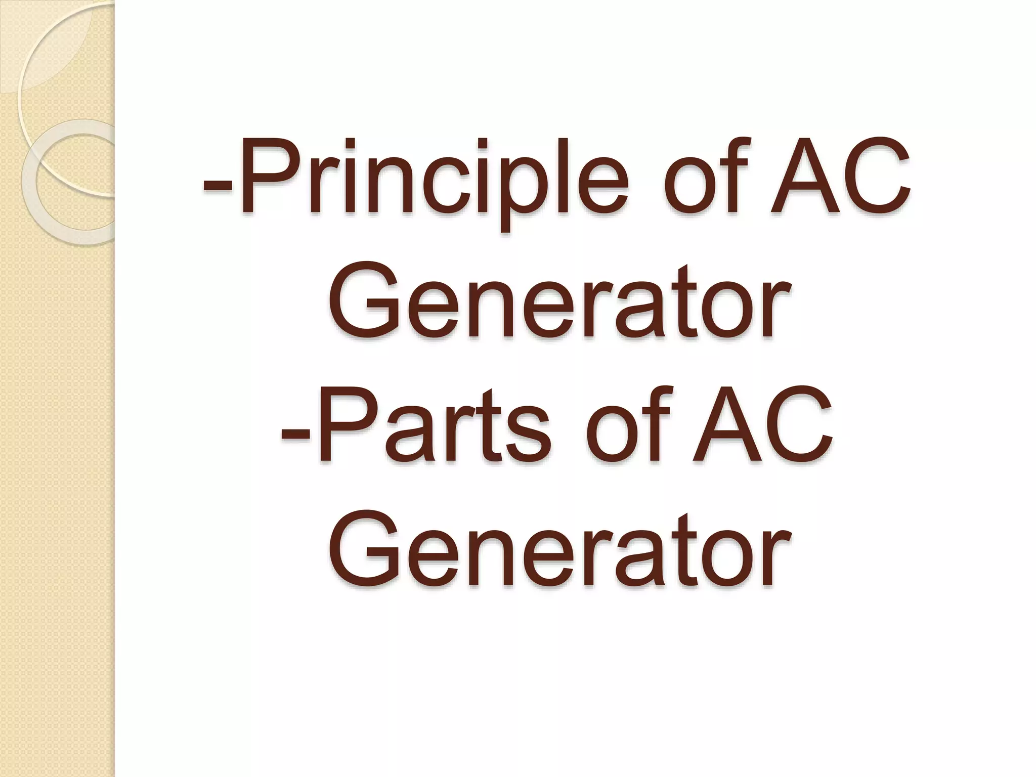 The document discusses the key components of AC generators, including the field, armature, prime mover, rotor, and stator. It explains that the field produces a magnetic flux, the armature produces voltage as this flux cuts through it, and the prime mover provides rotational power. There are two main types of AC generators - those with a stationary field and rotating armature, and those with a rotating field and stationary armature. The rotating field, stationary armature type is commonly used for large power generation.