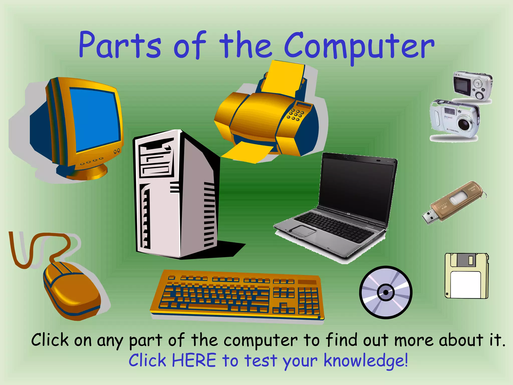 The document introduces the basic parts of a computer, including the monitor, keyboard, mouse, printer, CPU, floppy disk, CD, USB flash drive, digital camera, and laptop. It provides descriptions of each part and their functions. Students are instructed to learn the parts of the computer by clicking on images and answering multiple choice questions.