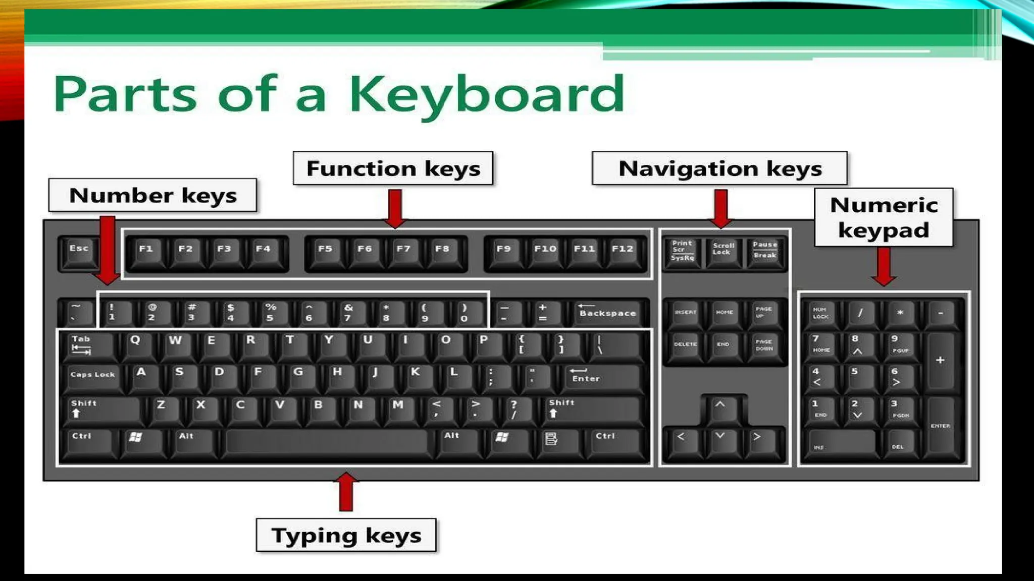 The document provides an overview of the keyboard's parts and functions, aiming for students to identify and appreciate its components. It details five major parts of the keyboard: number keys, function keys, navigation keys, numeric keypad, and typing keys, each with specific roles. Additionally, it includes instructions for a quiz to reinforce learning about keyboard functions.