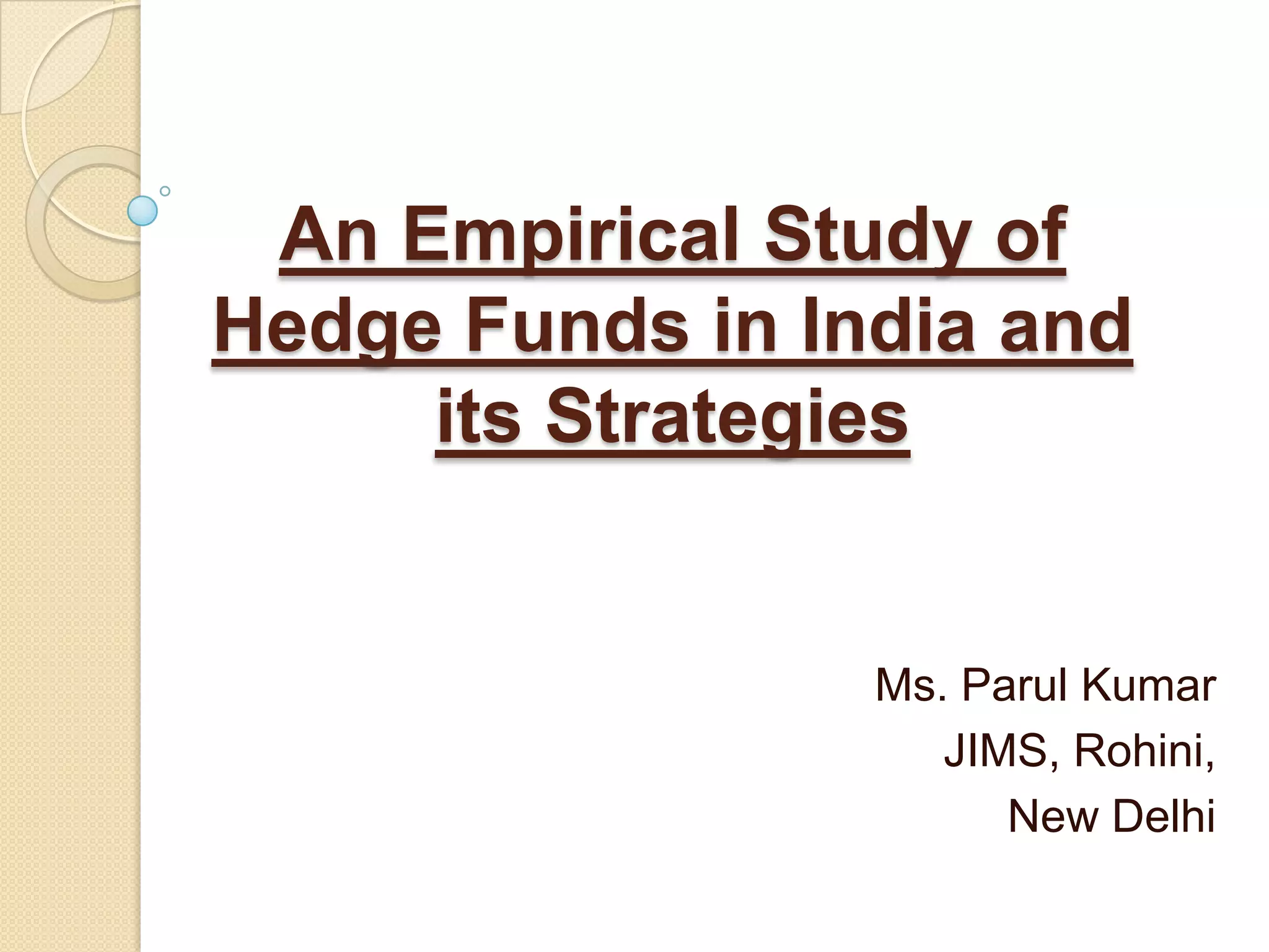 This document analyzes hedge fund strategies in India. It discusses what hedge funds are and their investment approaches. Several hedge fund strategies are evaluated based on their returns from 2006-2010 using the Hedge Fund Research Index and Dow Jones Credit Suisse indices. Merger arbitrage and market directional strategies performed best according to the HFRX index, while emerging markets and managed futures strategies led in the Dow Jones index. Convertible arbitrage ranked lowest in both indices. Indian hedge funds saw strong growth and returns improved in 2010.