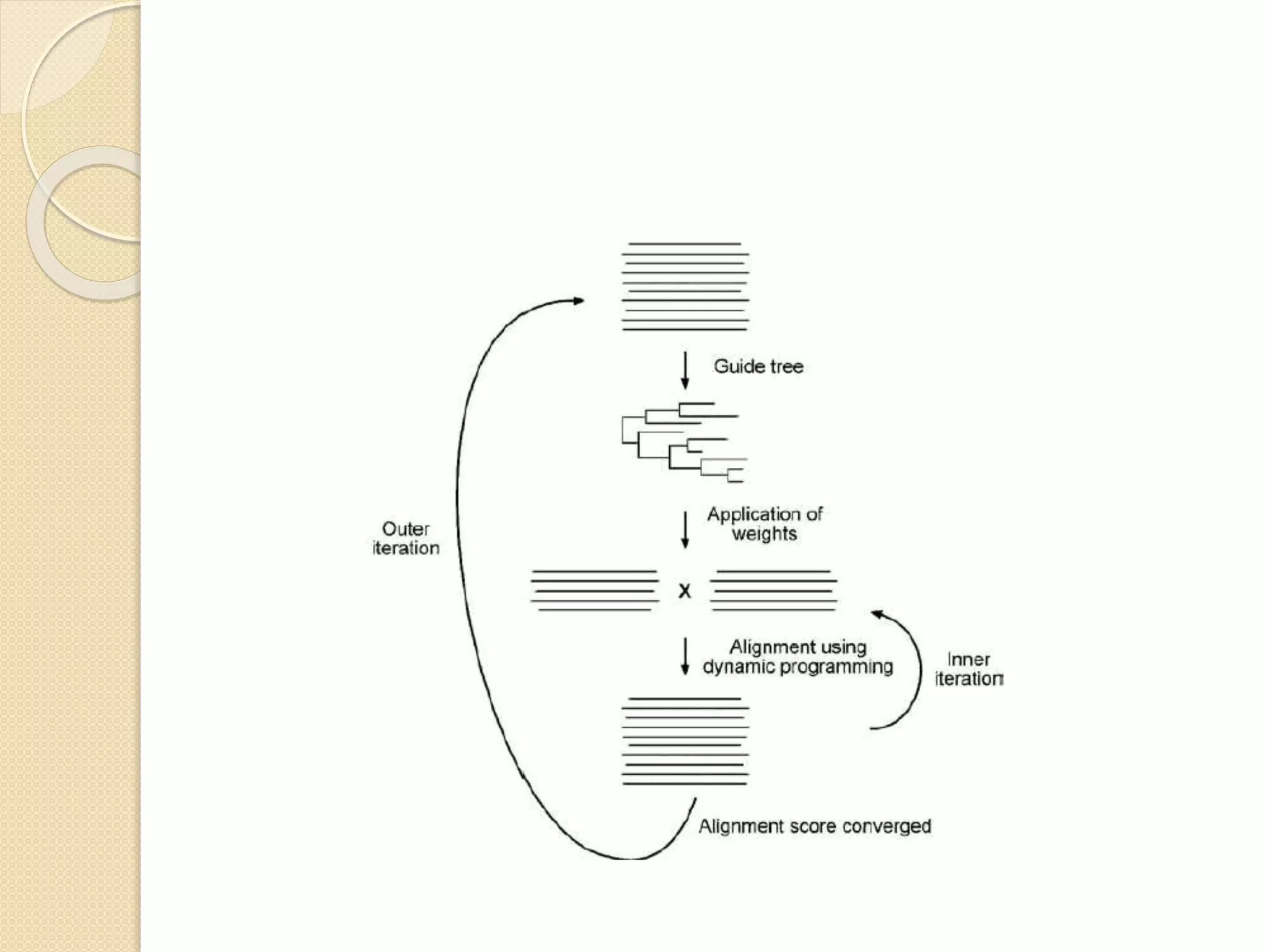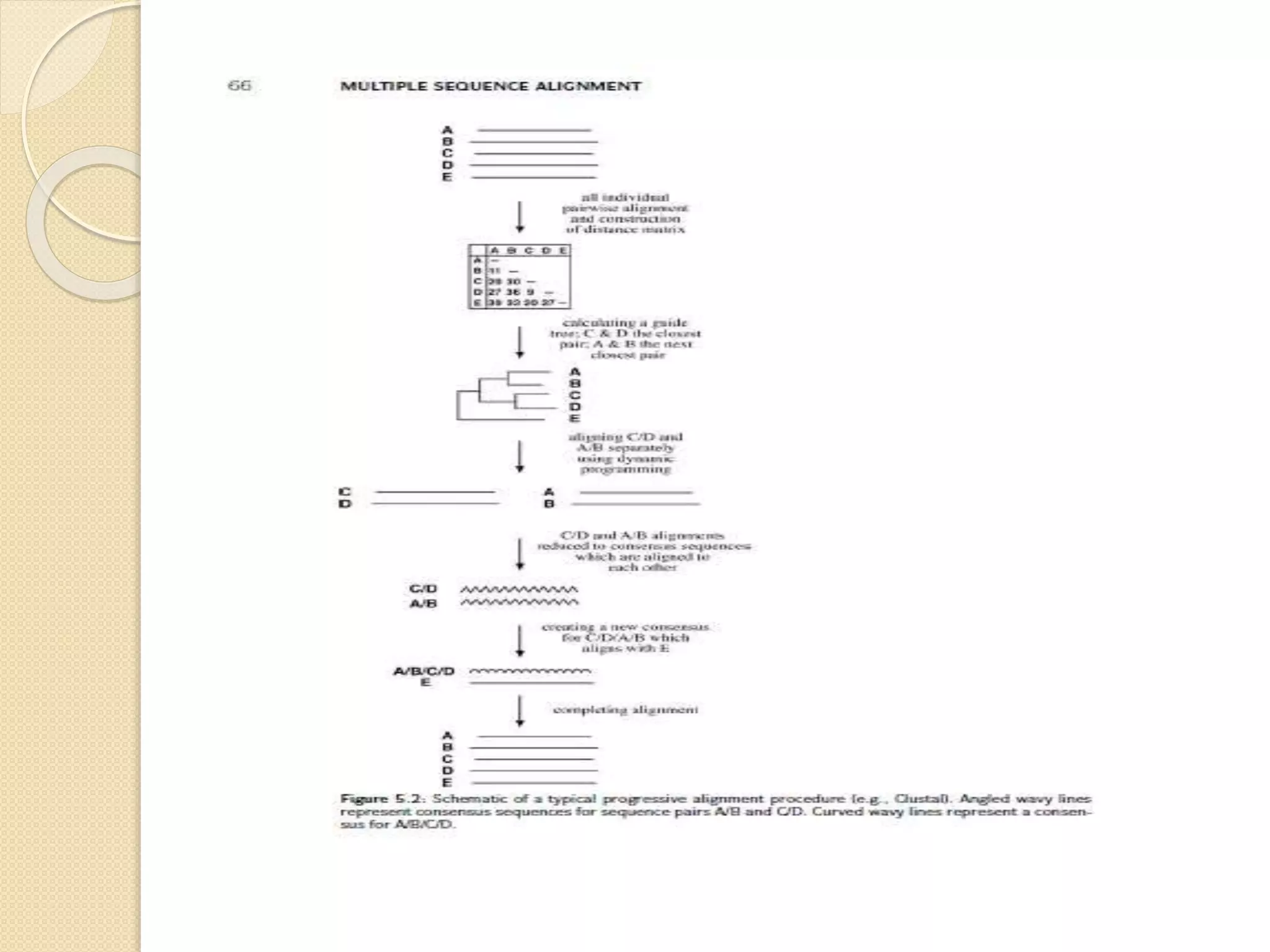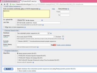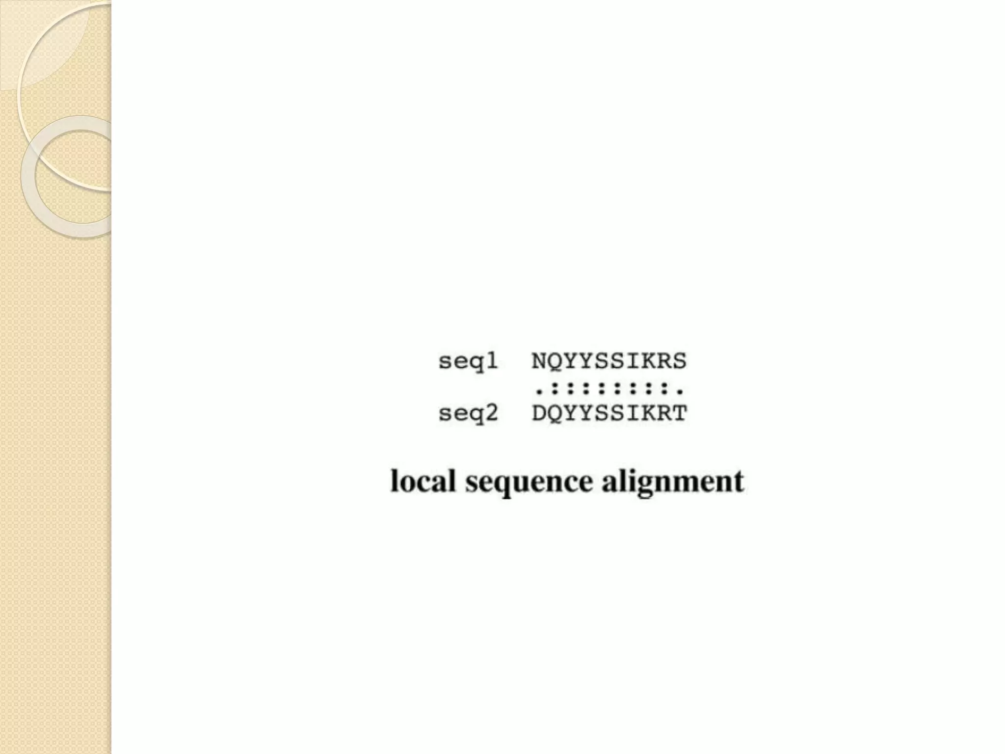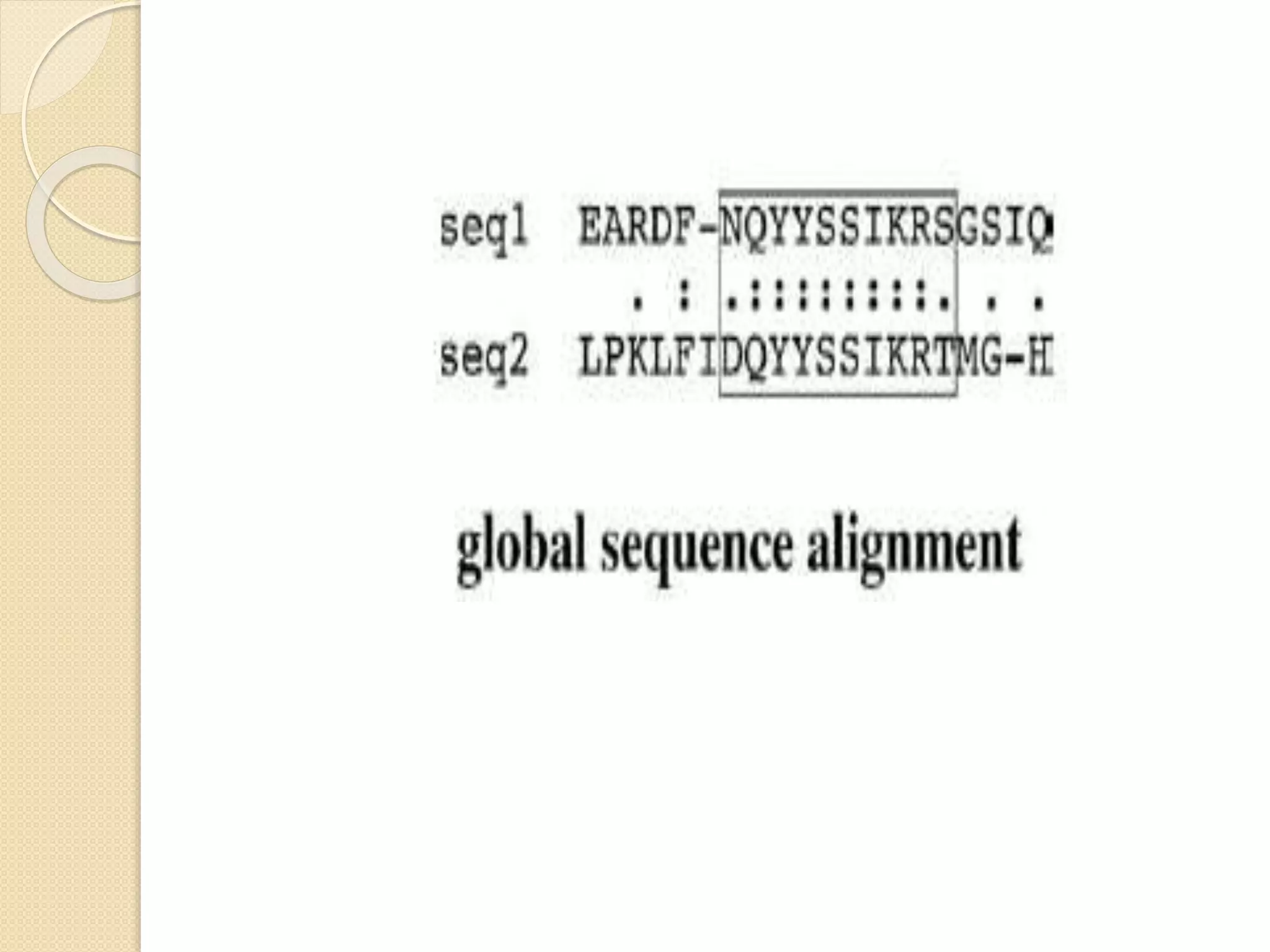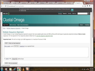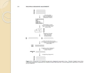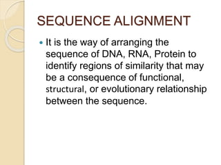 This document discusses various sequence alignment methods. It describes global alignment, which aligns two generally similar sequences over their entire length. Local alignment finds local regions of highest similarity between more divergent sequences. Pairwise alignment compares two sequences, while multiple sequence alignment handles three or more sequences using more sophisticated methods like progressive alignment and iterative alignment. Various online tools for sequence alignment are also mentioned, including BLAST, FASTA, and CLUSTAL Omega.
