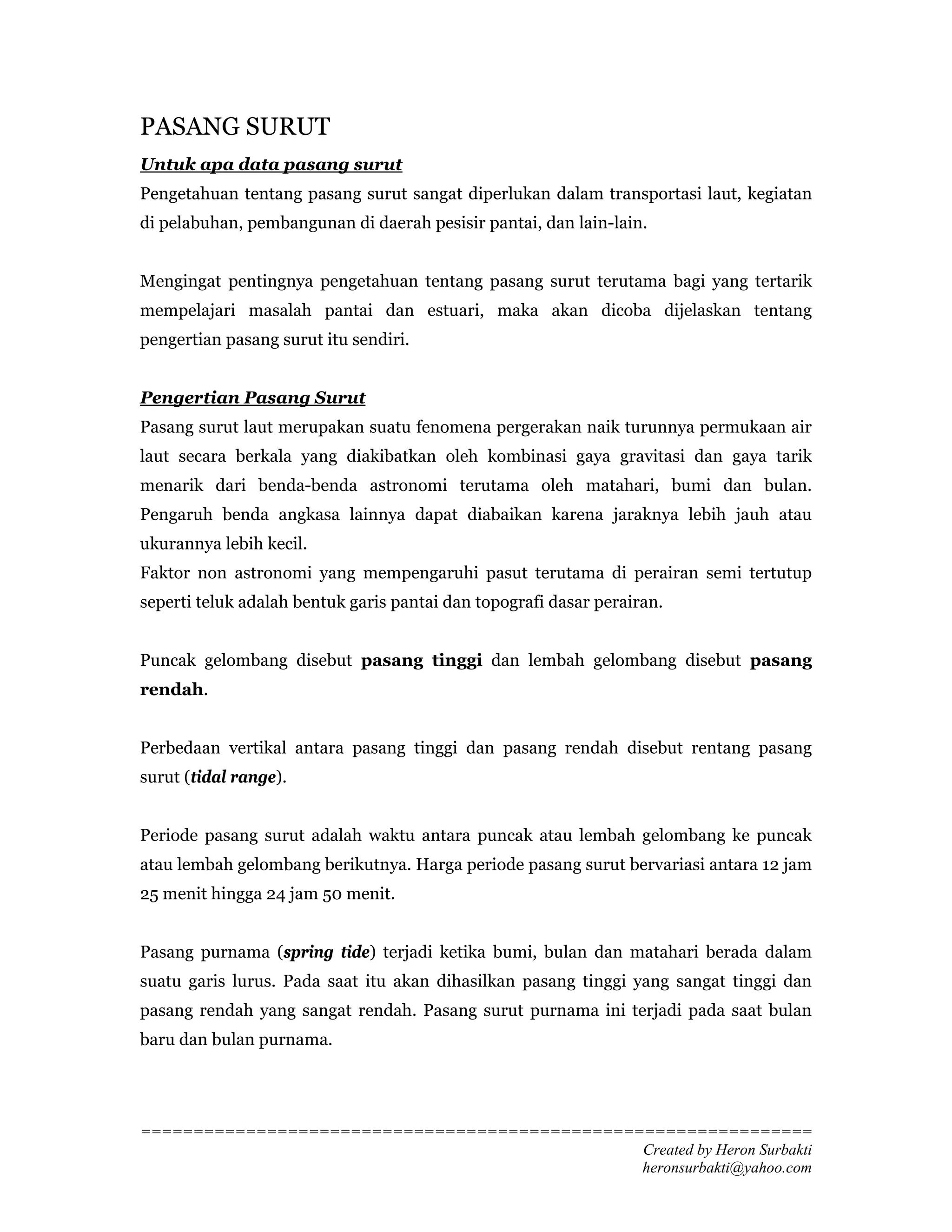 Dokumen tersebut menjelaskan tentang pengertian dan faktor-faktor yang mempengaruhi pasang surut, termasuk definisi istilah-istilah terkait pasang surut seperti spring tide, neap tide, dan istilah tingkat permukaan air laut.