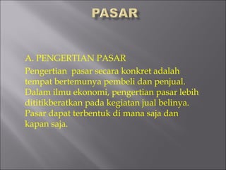 1. Pasar menurut ilmu ekonomi lebih menitikberatkan pada kegiatan jual beli, sedangkan secara konkret merujuk pada tempat bertemunya pembeli dan penjual.