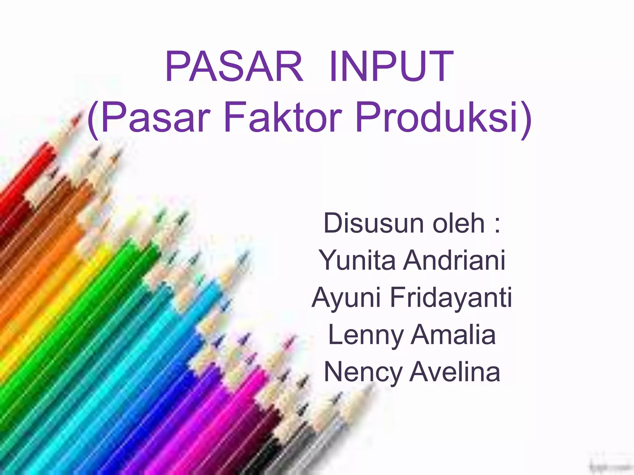 Pasar input adalah pasar yang menyediakan faktor produksi seperti tenaga kerja, modal, tanah, dan kewirausahaan. Permintaan faktor produksi bersifat turunan dari permintaan produk akhir. Harga faktor produksi dipengaruhi oleh harga output, teknologi, dan harga faktor lainnya. Pemerintah menetapkan upah minimum untuk melindungi tenaga kerja dari eksploitasi, sementara kenaikan nilai tanah di Jakarta menyebab