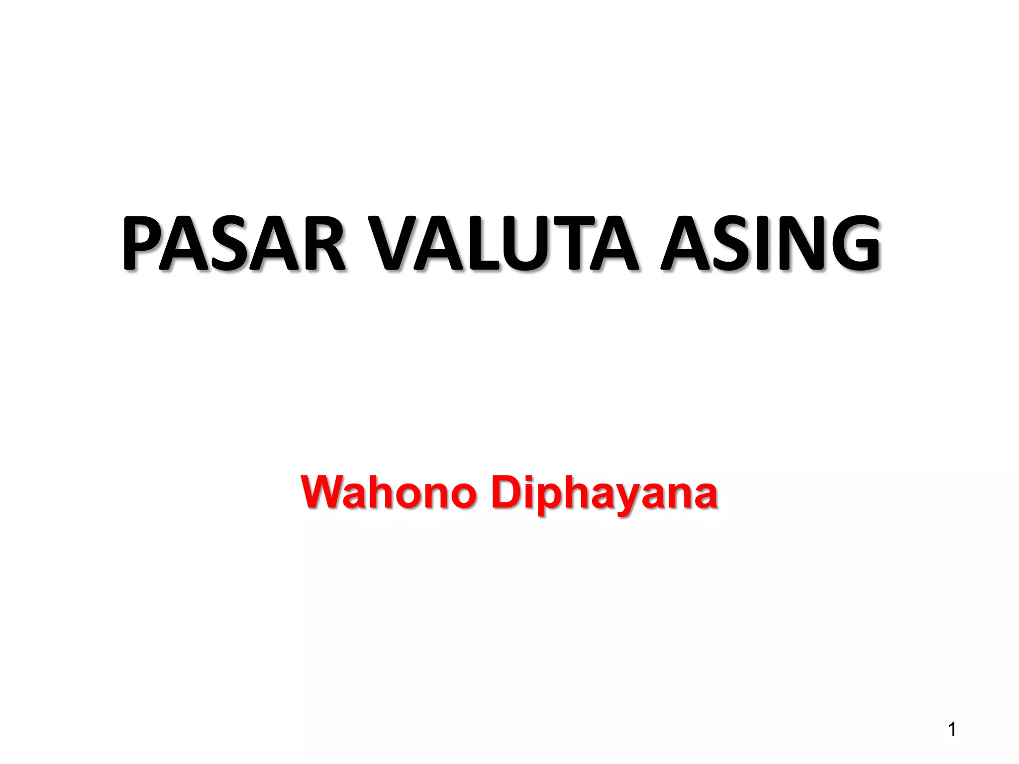 1. Dokumen tersebut membahas tentang pasar valuta asing (valas) termasuk pengertian valas dan kurs valas, sistem moneter internasional, sistem nilai tukar, pengertian pasar valas, transaksi di pasar valas, para pelaku pasar valas, dan faktor yang mempengaruhi permintaan dan penawaran valas.