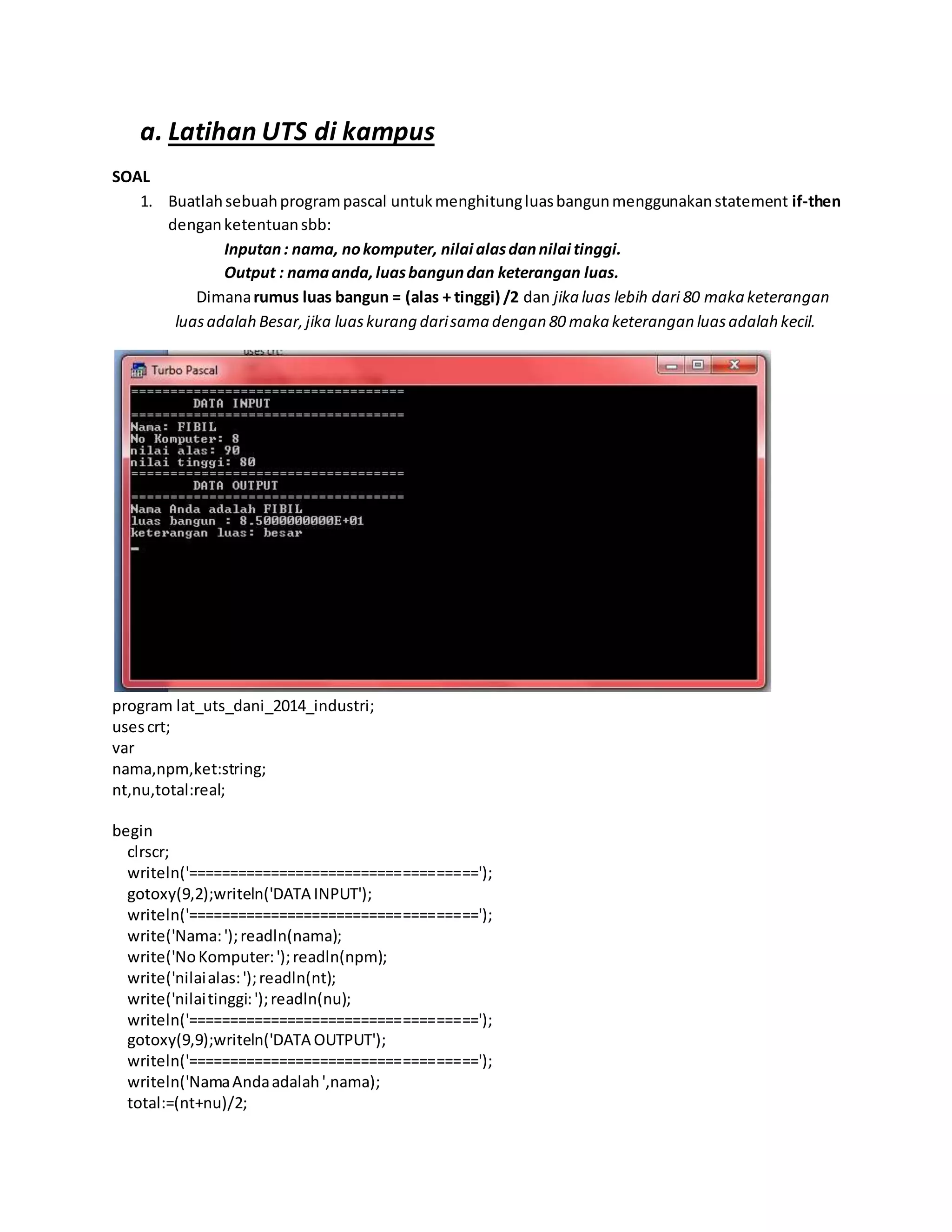 Dokumen tersebut berisi dua soal latihan UTS mengenai pembuatan program Pascal untuk menghitung luas bangun dan nilai akhir mahasiswa menggunakan pernyataan if-then. Pada soal pertama meminta untuk menghitung luas bangun dengan input nama, nomor komputer, nilai alas dan tinggi, keluaran berupa nama, luas dan keterangan luas. Pada soal kedua meminta untuk menghitung nilai akhir mahasiswa dengan input nama, npm