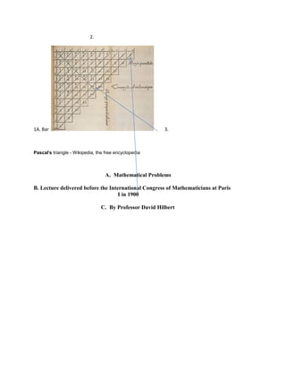 Pascal's triangle is a triangular array of the binomial coefficients where each number is the sum of the two numbers directly above it. In 1900, Professor David Hilbert delivered a lecture before the International Congress of Mathematicians where he discussed mathematical problems and mentioned Pascal's triangle as an example.