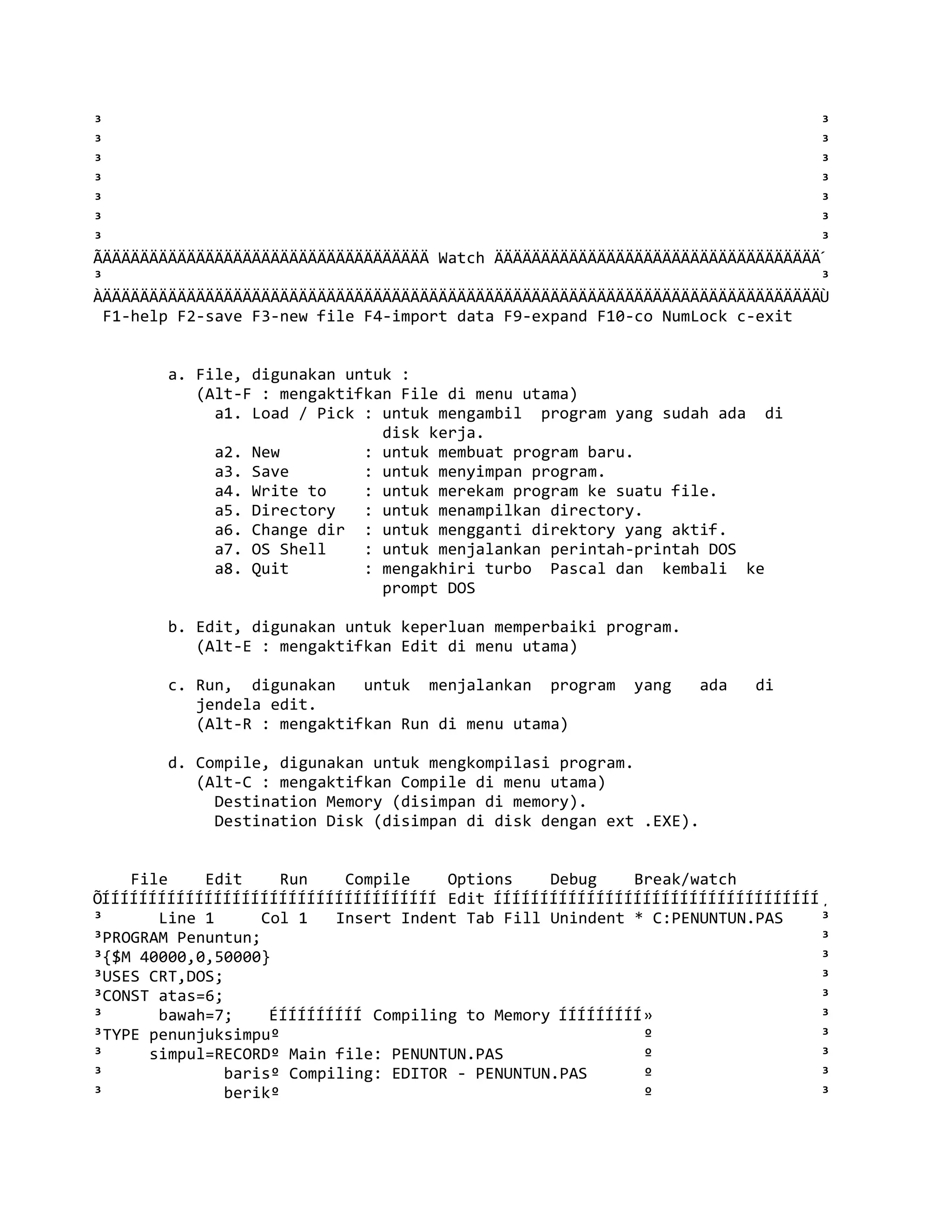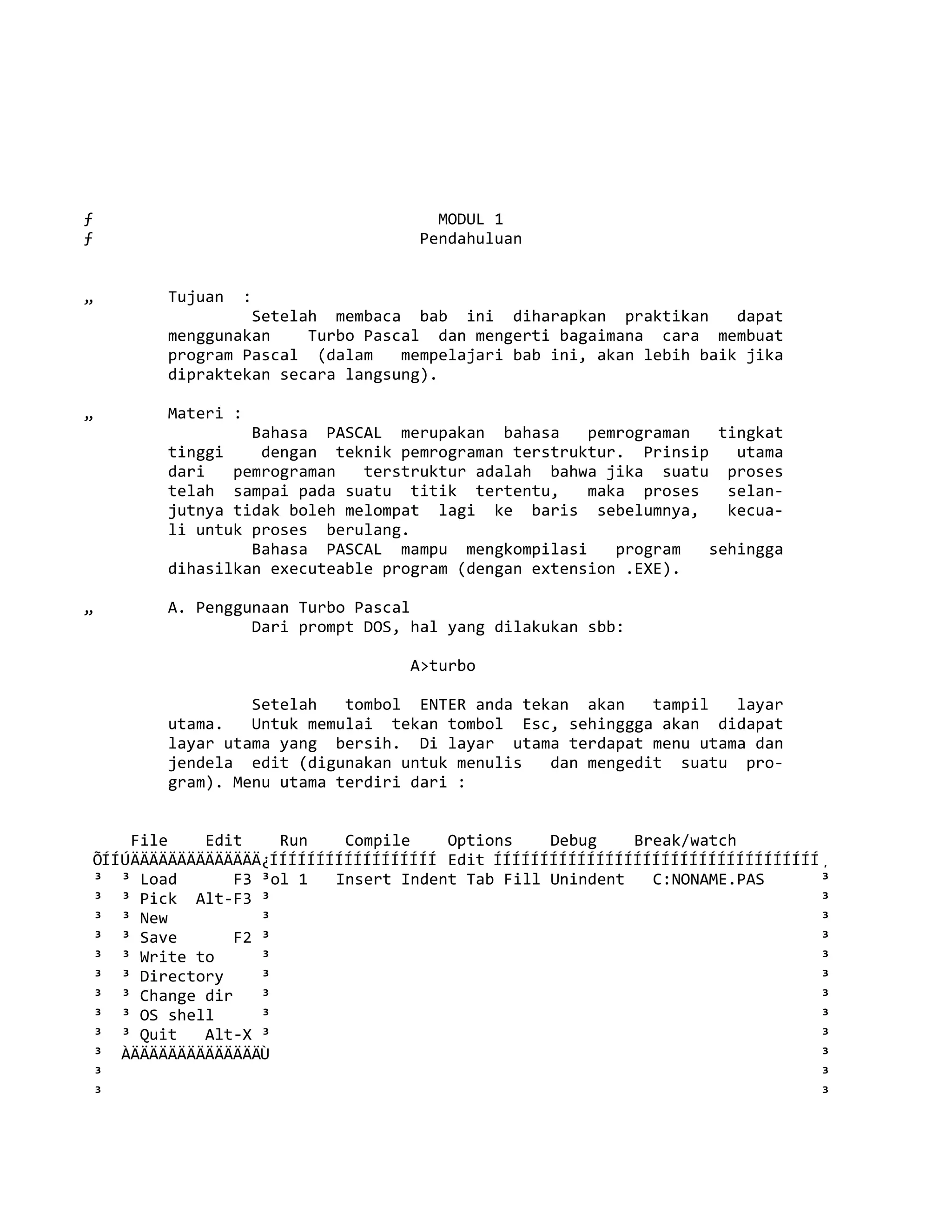 Dokumen ini adalah modul pengantar untuk menggunakan Turbo Pascal, menjelaskan teknik pemrograman terstruktur yang mendasari bahasa Pascal, serta berbagai langkah pengoperasian dan pengaturan dalam Turbo Pascal. Selain itu, modul ini juga menguraikan struktur program Pascal, termasuk bagian judul, tubuh program, dan berbagai deklarasi serta tipe data yang digunakan. Siswa diharapkan untuk mempraktikkan konsep-konsep ini secara langsung untuk pemahaman yang lebih baik.