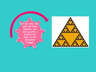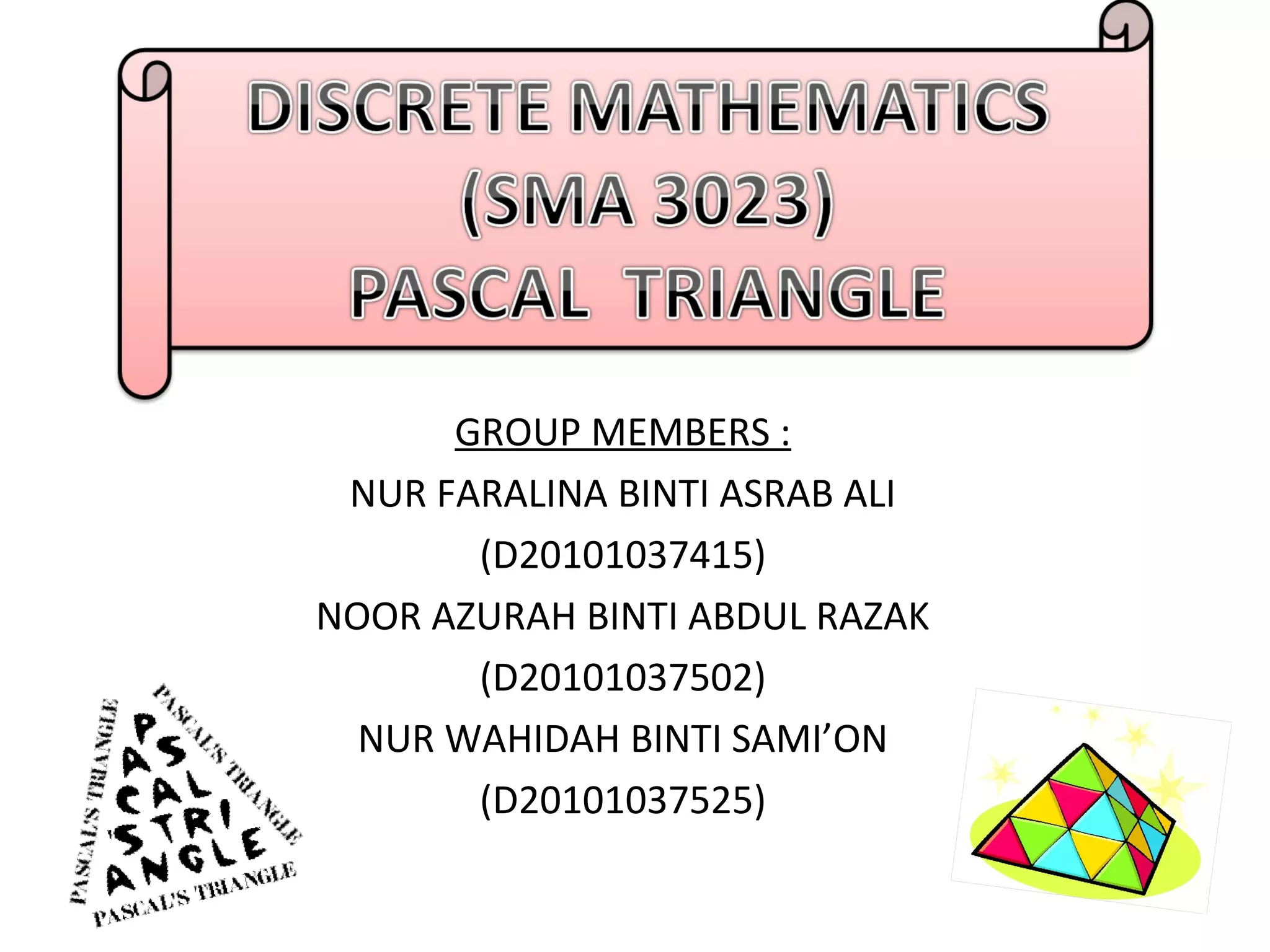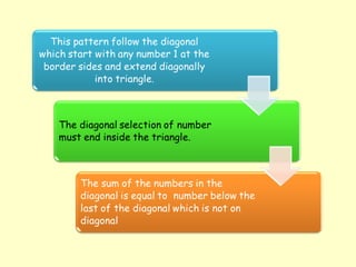The document discusses Pascal's triangle, a mathematical pattern named after French mathematician Blaise Pascal. It contains properties like the Fibonacci sequence and uses like binomial expansion. Pascal was not the first to document the triangle - others like the Persians and Chinese used it earlier. The document also explains how Pascal's triangle can be used to calculate combinations and probabilities in events like coin tosses.