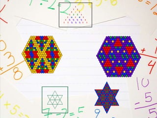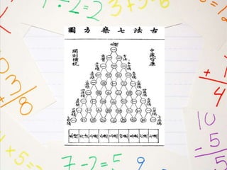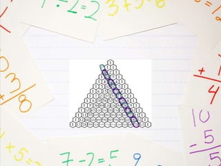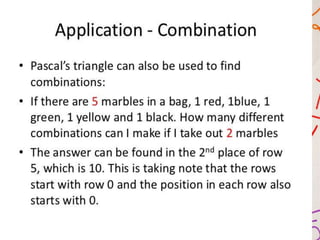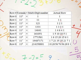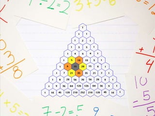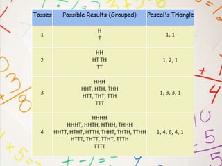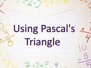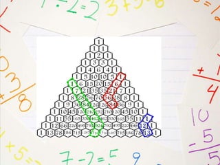 Pascal's triangle is a triangular array of the binomial coefficients where each number is the sum of the two numbers directly above it. It was studied by mathematicians as early as ancient Greece, India, and China, but Pascal organized the information and popularized its uses in probability. The triangle demonstrates many mathematical properties and patterns such as the Fibonacci sequence, triangular numbers, binomial coefficients, and it can be used to calculate combinations and probabilities of outcomes.