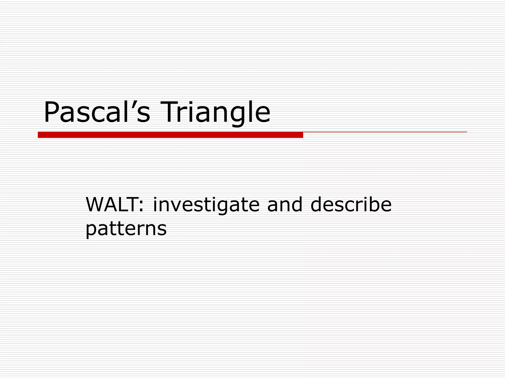 The document explores Pascal's Triangle, named after mathematician Blaise Pascal, highlighting its historical significance and its use in probability. It discusses rules for completing the triangle, patterns in row totals, and diagonal relationships such as triangular and tetrahedral numbers. Additionally, it examines the distribution of odd and even numbers, encouraging investigations into color patterns and ratios within the triangle.