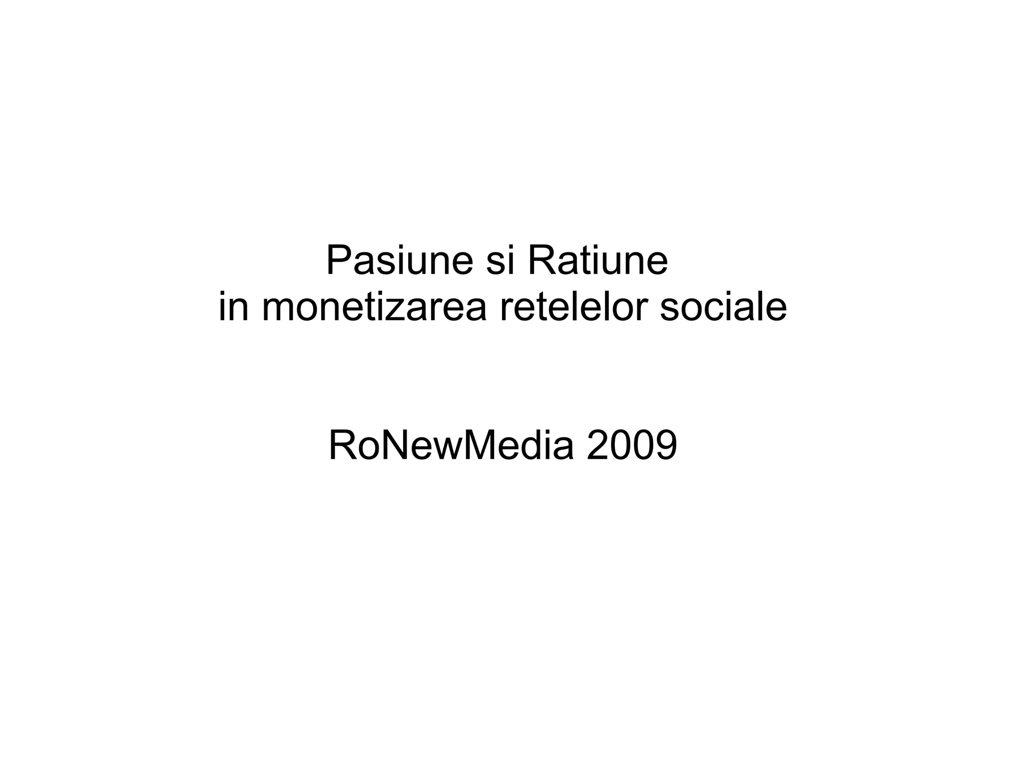 Documentul discută despre monetizarea rețelelor sociale printr-o combinație de pasiune și rațiune. Aceasta include utilizarea identității, asocierilor, targetării și mesajelor pentru a atrage publicul țintă. Se concluzionează că internații sunt pasionați de rețele sociale și că încrederea în branduri se construiește în timp, comunicarea având un caracter bidirecțional.
