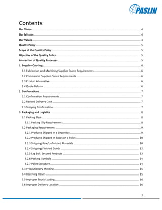 This document is a supplier manual that outlines the vision, mission, values, quality policy, and procedures for suppliers of Paslin. It details Paslin's commitment to continuous quality improvement and compliance with ISO 9001:2008. The manual provides guidelines for suppliers on processes like quoting, order confirmations, packaging and shipping, invoicing, and key contacts.