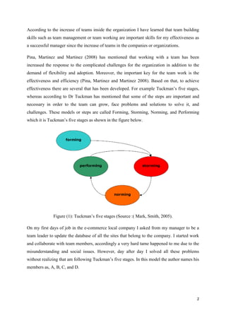 management, and self-awareness. It analyzes Tuckman's model of group development (forming,