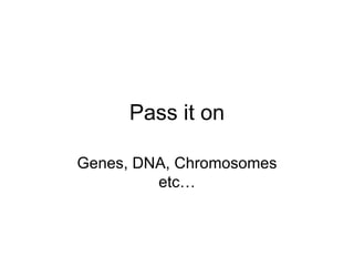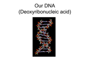 This document discusses how genetic traits are passed down from parents to children. It notes that DNA contains the genetic code that is inherited and looks at examples of physical traits like earlobes, the ability to roll one's tongue, dimples, eyelid structure, handedness, eye and hair color, and hair texture that may be passed from one generation to the next based on genetics. Examples of both similar and differing traits in two families are provided to demonstrate genetic inheritance of characteristics.