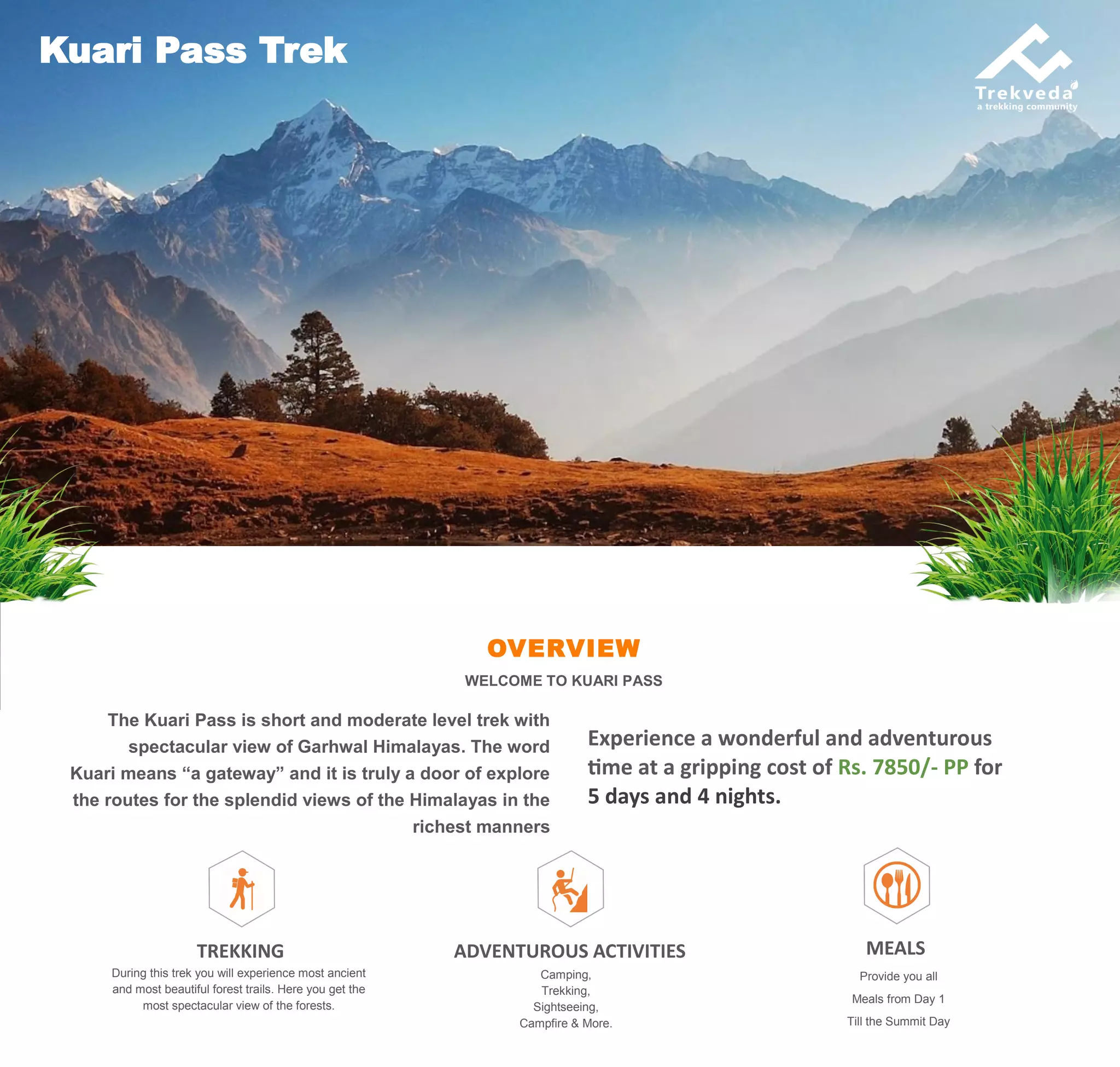 The document provides an overview and itinerary for a 5-day, 4-night Kuari Pass trek in Uttarakhand, India. The trek begins in Joshimath and involves hiking to destinations like Dakh, Gulling Top, and Kuari Pass, with the highlight being reaching the summit of Kuari Pass on the fourth day. The itinerary details the daily trekking routes and highlights. Meals, accommodations, equipment, and medical support are included in the package. Transportation, additional meals, and personal gear are excluded.