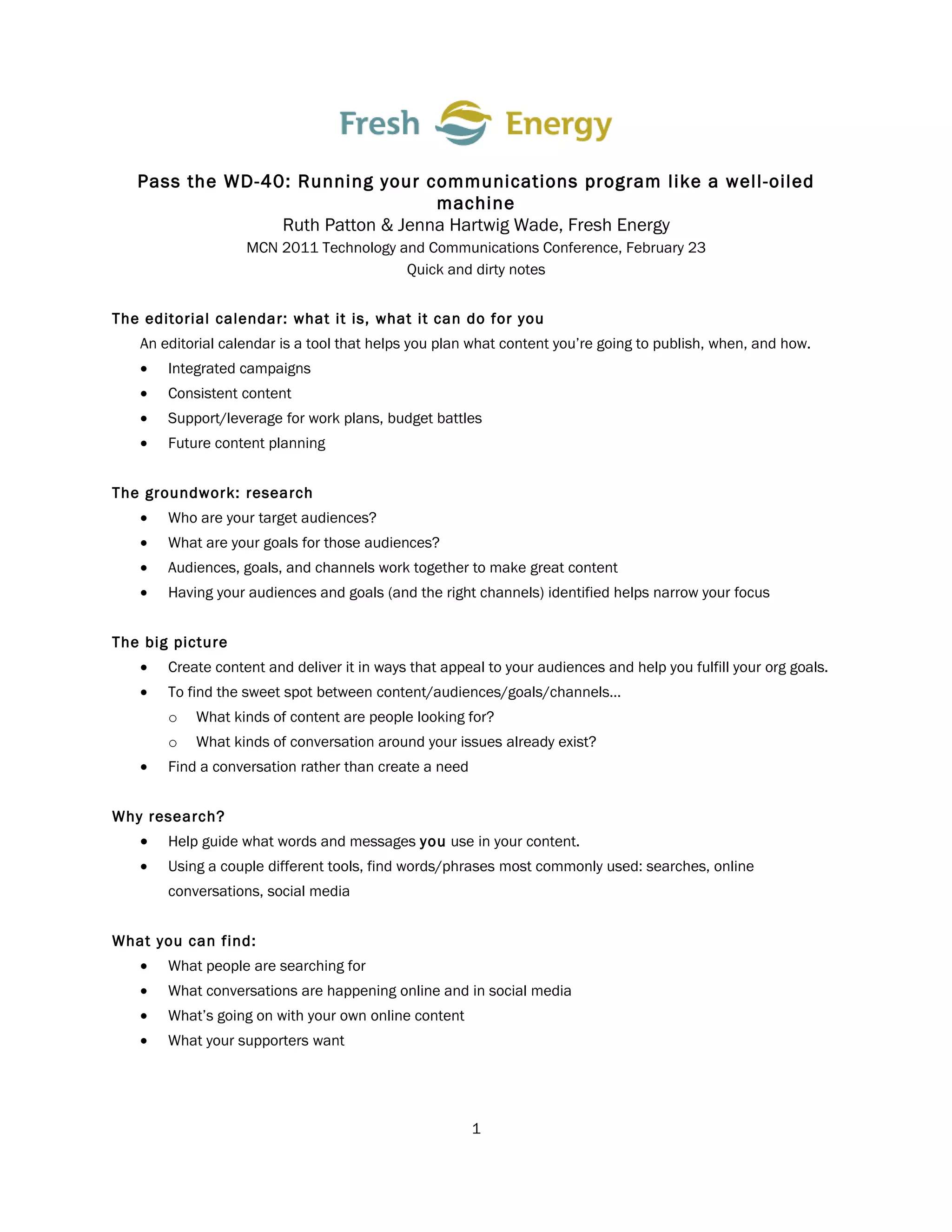 An editorial calendar is a planning tool that helps organizations consistently publish relevant content across channels by scheduling what will be published, when, and how. Researching target audiences, goals, current online conversations and searches helps guide the types of content created and how it is delivered. Creating an editorial calendar, from a simple paper version to a detailed online or spreadsheet tool, allows mapping out content ideas, assignments, deadlines and more for an integrated communications strategy.