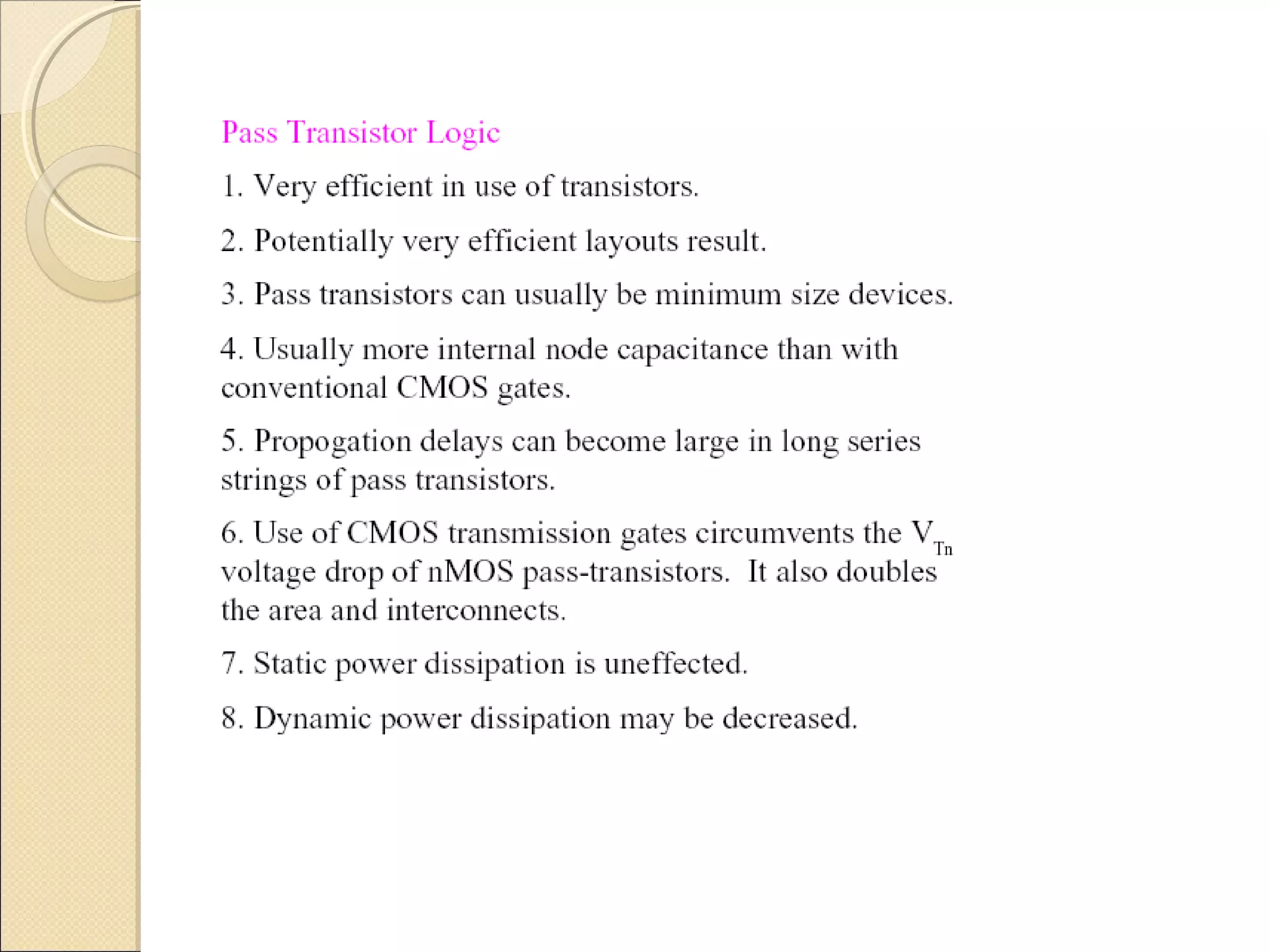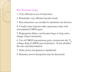 The document discusses pass transistor logic circuits. It describes how nMOS pass transistors can transfer logic 1 and 0 signals. Transmission gates are introduced which use both nMOS and pMOS pass transistors to pass strong signals in both directions. Applications of transmission gates include multiplexers, XOR gates, D latches, and D flip-flops. Clock skew management and different pass transistor logic families are also covered.