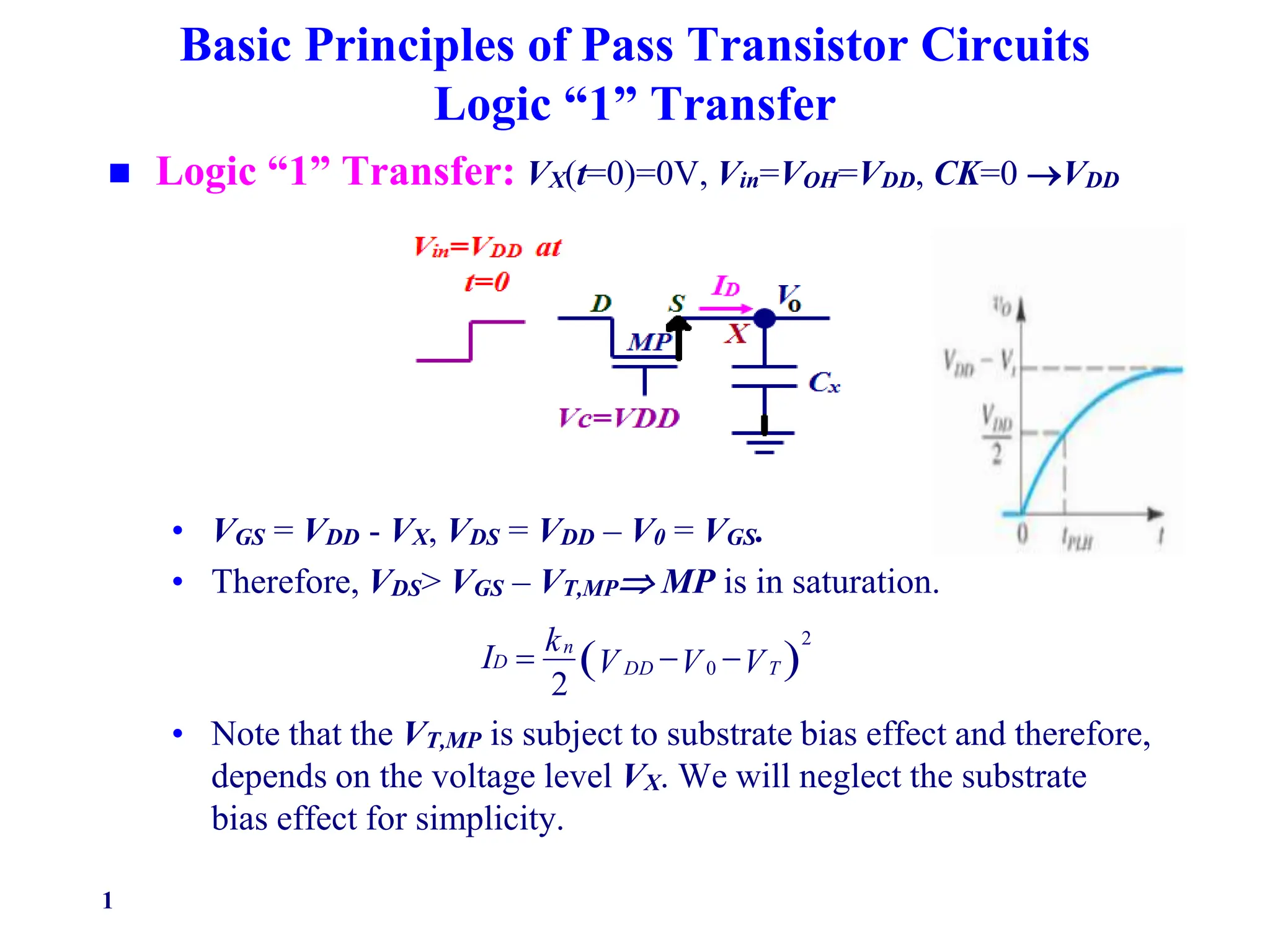 The document discusses the principles of pass transistor circuits, focusing on the transfer of logic '1' and '0', highlighting current flow, saturation, and effects such as substrate bias. It describes transmission gates as effective switches for both digital and analog applications, enabling bidirectional current flow with constant on-resistance. Additionally, it covers dynamic CMOS precharge-evaluate logic, emphasizing its advantages, such as reduced transistor count and low static power dissipation, alongside disadvantages like time constraints for output availability.