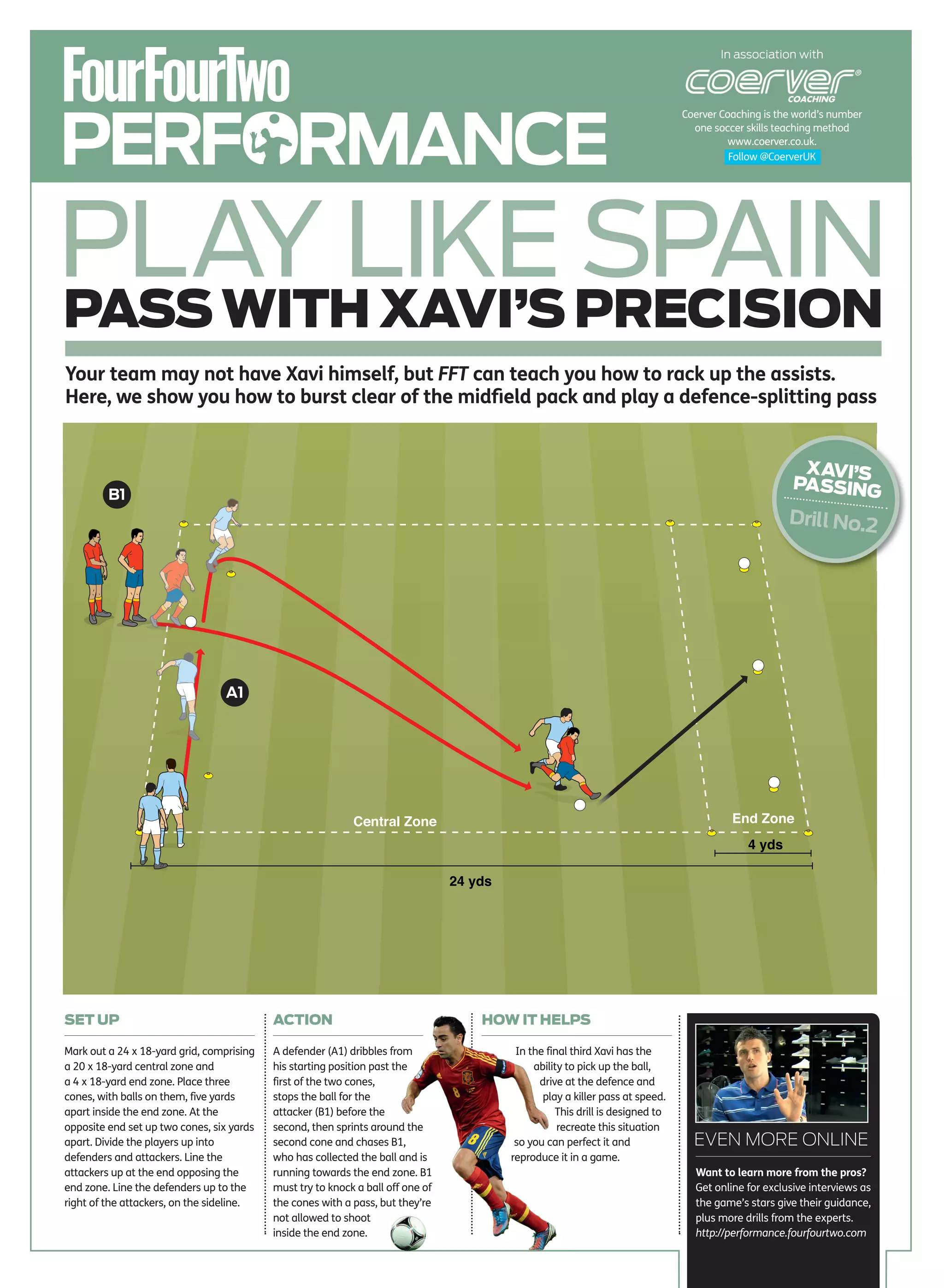This drill teaches players how to play precise defense-splitting passes like Xavi. The drill involves a defender dribbling around cones to pick up the ball and drive at defenders before passing to an attacker in the end zone, who must knock a ball off a cone with a pass without shooting. Recreating pressure situations helps players perfect the ability to pick up the ball, drive, and play a killer pass at speed to break down defenses. The drill is designed to help players reproduce these skills in matches.