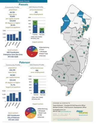 The Urban Enterprise Zone program in New Jersey offers tax incentives and financial assistance to encourage business growth and job creation in designated urban communities. Businesses certified in a UEZ can receive benefits like reduced sales tax rates, tax exemptions on certain purchases and investments, and tax credits for hiring employees or making qualified investments. The program has helped create over 4,000 new jobs in Paterson and over 2,500 new jobs in Passaic County.
