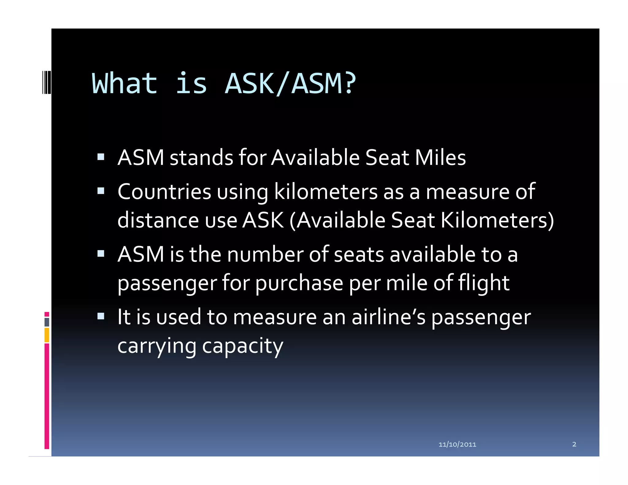 The document explains key aviation metrics including Available Seat Miles (ASM), Revenue Passenger Miles (RPM), and Passenger Load Factor (PLF). ASM measures an airline's passenger carrying capacity, while RPM indicates the number of paying passengers flown; PLF represents the efficiency of capacity utilization. Calculations and examples are provided to illustrate these concepts.