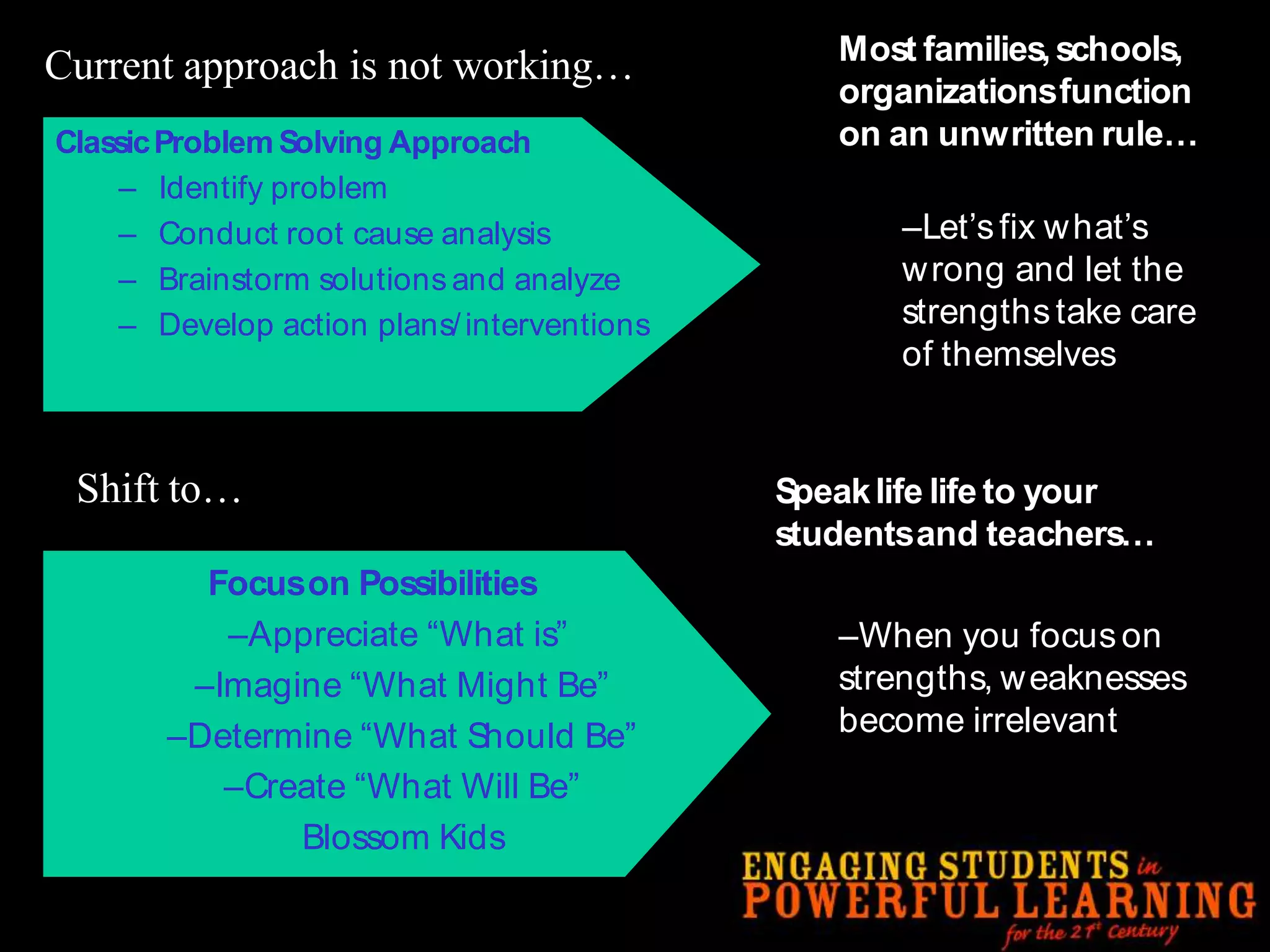 This document discusses the need to unlearn traditional approaches to teaching and learning and adopt more modern, student-centered pedagogies. It highlights moving from deficit-based to strength-based learning, collaboration both inside and outside the classroom, and using multiple channels including both synchronous and asynchronous tools. The document also emphasizes that effective technology integration depends on the teaching approaches used and that the focus should be on learning rather than the technology itself.