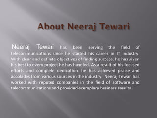 Neeraj Tewari has had a successful career in the telecommunications industry, working on major projects for companies like Hughes. He has experience in roles such as sales, marketing, program management and engineering. Tewari is recognized for his skills in telecommunications and information technology. In his spare time, he enjoys photography, which he views as a passion and hopes to improve at over time.