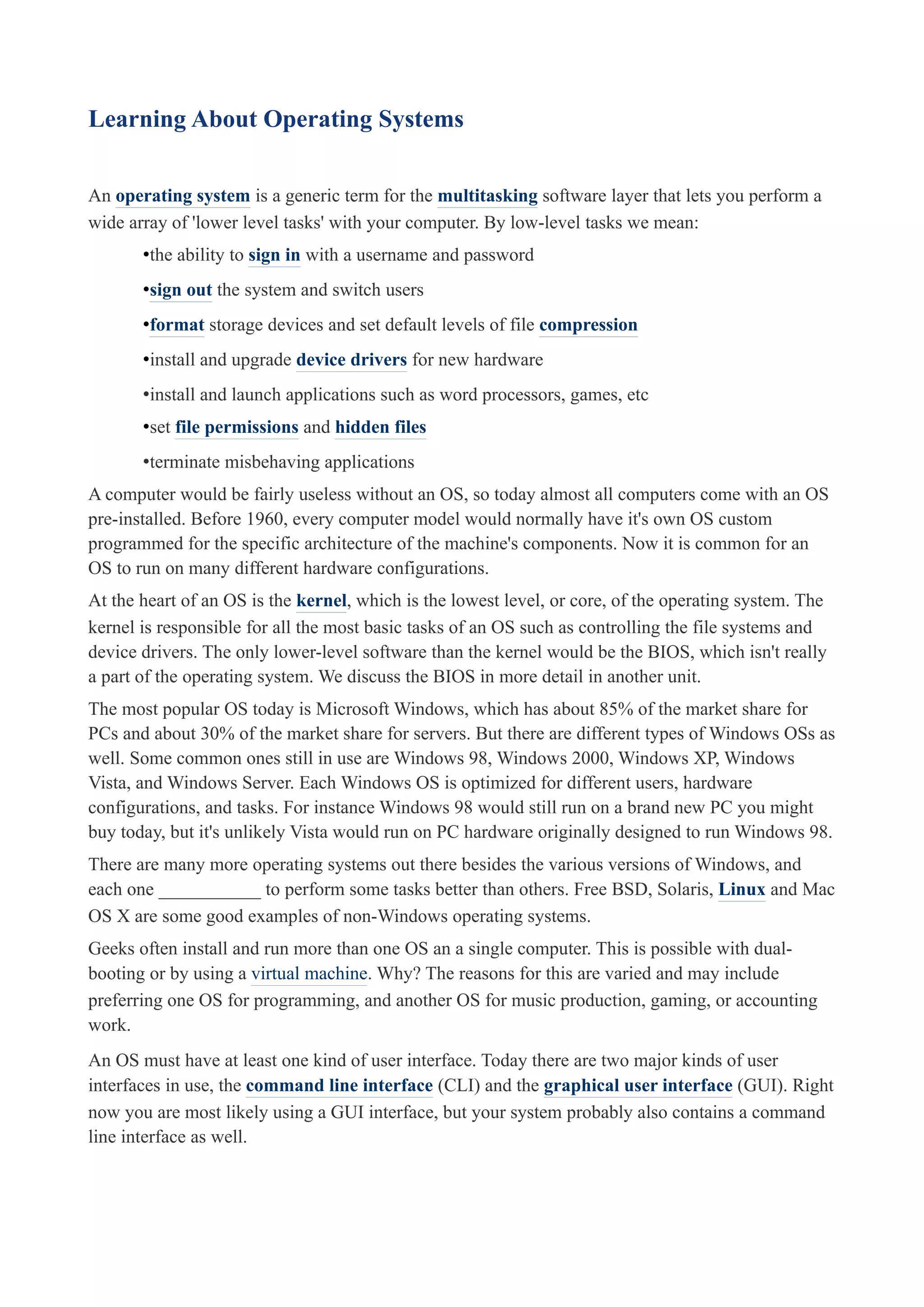 An operating system (OS) is the core software that allows users to perform tasks like signing in, installing applications, and managing hardware on a computer. Without an OS, computers would be useless. In the past, each computer model had its own custom OS, but now most computers come preinstalled with popular OSs like Windows, Linux, Mac OS X, and others. At the core of an OS is the kernel, which controls fundamental tasks like file systems and device drivers. OSs also have user interfaces, with graphical user interfaces (GUIs) being the most common today. Examples of popular OSs with GUIs include Windows, Mac OS X, and Linux-based systems like Ubuntu, which is a free OS that