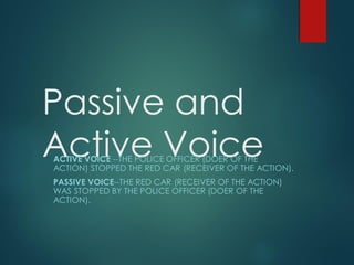 The document discusses the differences between active and passive voice in sentences. It provides examples of sentences written in both active and passive voice. It notes that active voice is preferred in formal writing, but passive voice can be used when the doer of the action is unknown or unimportant. It also discusses how to form sentences in passive voice using different tenses.