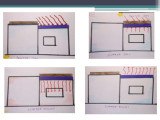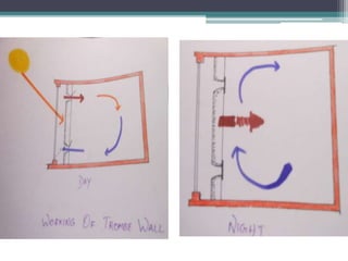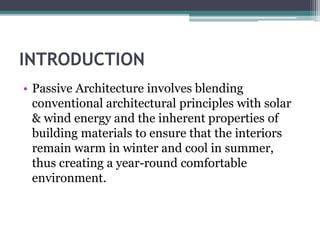 This document discusses passive architecture design systems that utilize natural elements like solar energy, wind, and thermal mass to regulate indoor temperatures without mechanical systems. Key passive design elements mentioned include thermal mass construction, wind towers, passive downdraft evaporative cooling, earth tunnel cooling, ventilated roofs, roof gardens, Trombe walls, solar chimneys, and light shelves. These design strategies aim to keep interiors warm in winter and cool in summer through natural ventilation and passive heating and cooling principles.