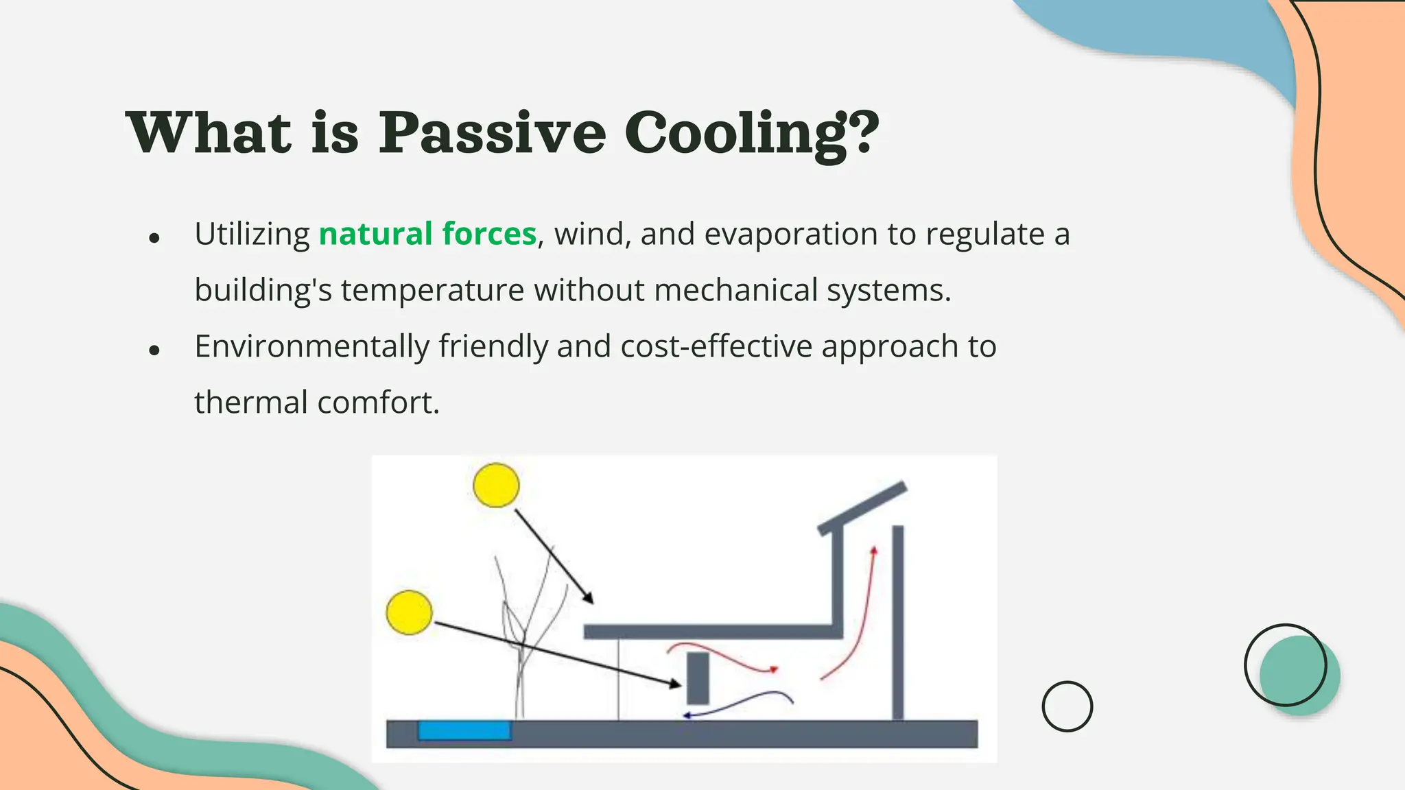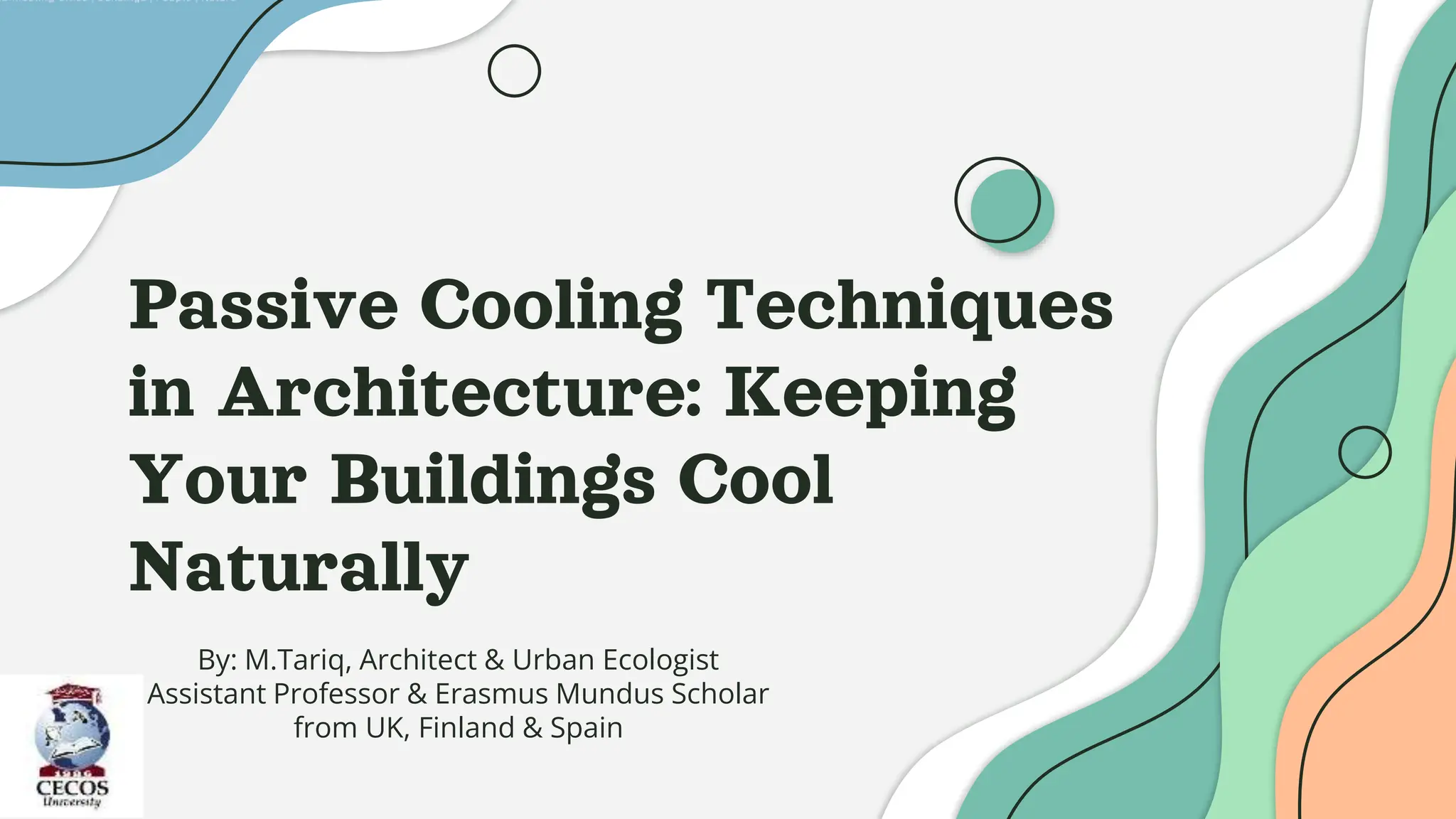Passive cooling techniques utilize natural forces like wind and evaporation to regulate building temperatures without mechanical systems. This document discusses several passive cooling strategies like site planning and orientation to maximize shade and ventilation, buffering structures with trees, stack ventilation using natural heat transfer and chimneys, evaporative cooling with water features, and traditional courtyard houses and earthen architecture which provide natural thermal regulation. Passive cooling is important to reduce energy usage, lower emissions, and create healthier indoor spaces.