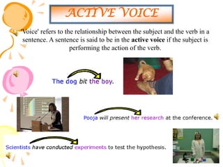 The document discusses active and passive voice in English grammar. It defines active voice as having the subject perform the action of the verb, while passive voice has the subject receive the action. Passive voice is formed using a form of the auxiliary verb "be" and the past participle. The document provides examples of passive voice constructions in different tenses and notes some common reasons to use passive voice over active, such as when the agent is unknown, not the focus, or obvious from context. It also discusses how to convert a passive sentence to active voice.