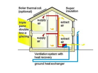PassivHaus buildings use superinsulation and mechanical ventilation with heat recovery to significantly reduce heat transfer and maintain indoor air quality without a conventional heating system. Ventilation systems employ earth tubes to pre-heat intake air in cold weather. Space heating needs are extremely low due to intrinsic heat sources within the building and high-performance triple-pane windows that provide winter heat gains. With careful design, no supplemental heat may be needed beyond the heat recovery ventilation. A variety of small renewable or fossil fuel sources can provide the minimal needed heating.